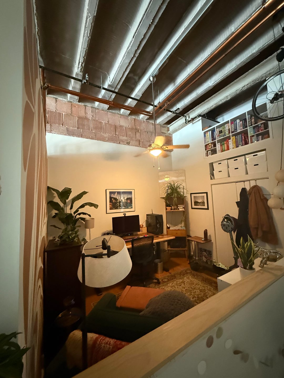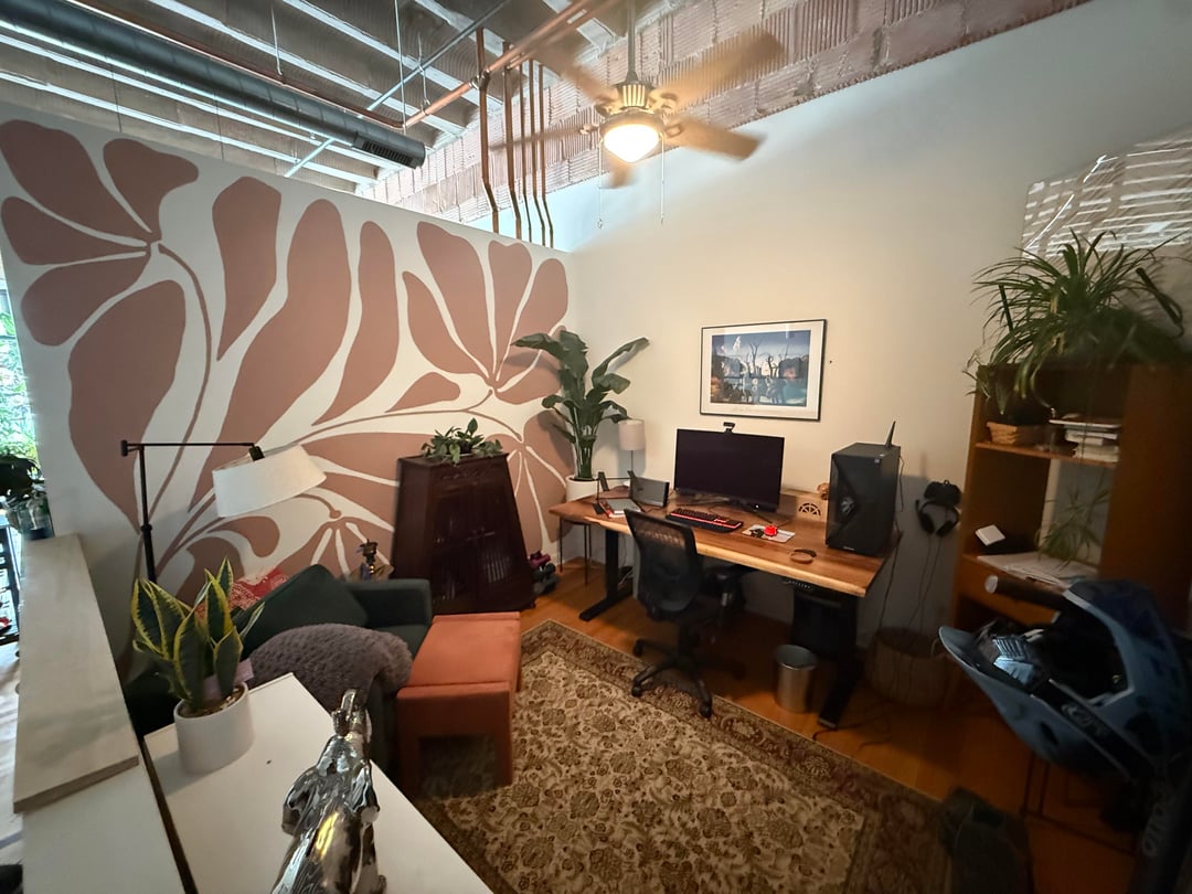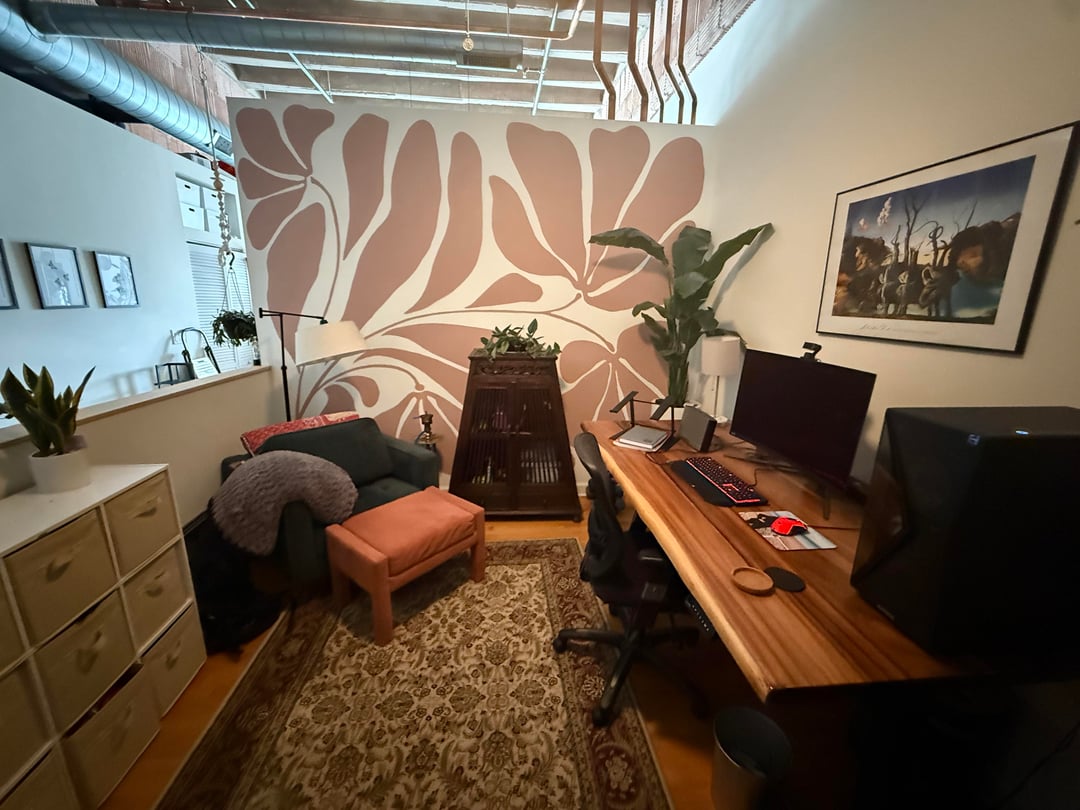 I painted this accent wall, but it feels unbalanced. Do I need to get rid of the cabinet, lamp, or (fake) plant? Should I hang something on the wall? I feel like the answer is to get rid of the cabinet, but I don’t have anywhere else in my apartment I can put it.