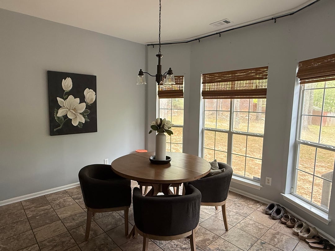 Dining room: The cool tone grey walls are taking away from the warm, cozy vibe. I’d paint. You could even continue the green from the living room. Find another place for the shoes or get a shoe rack. Different window treatments would help.