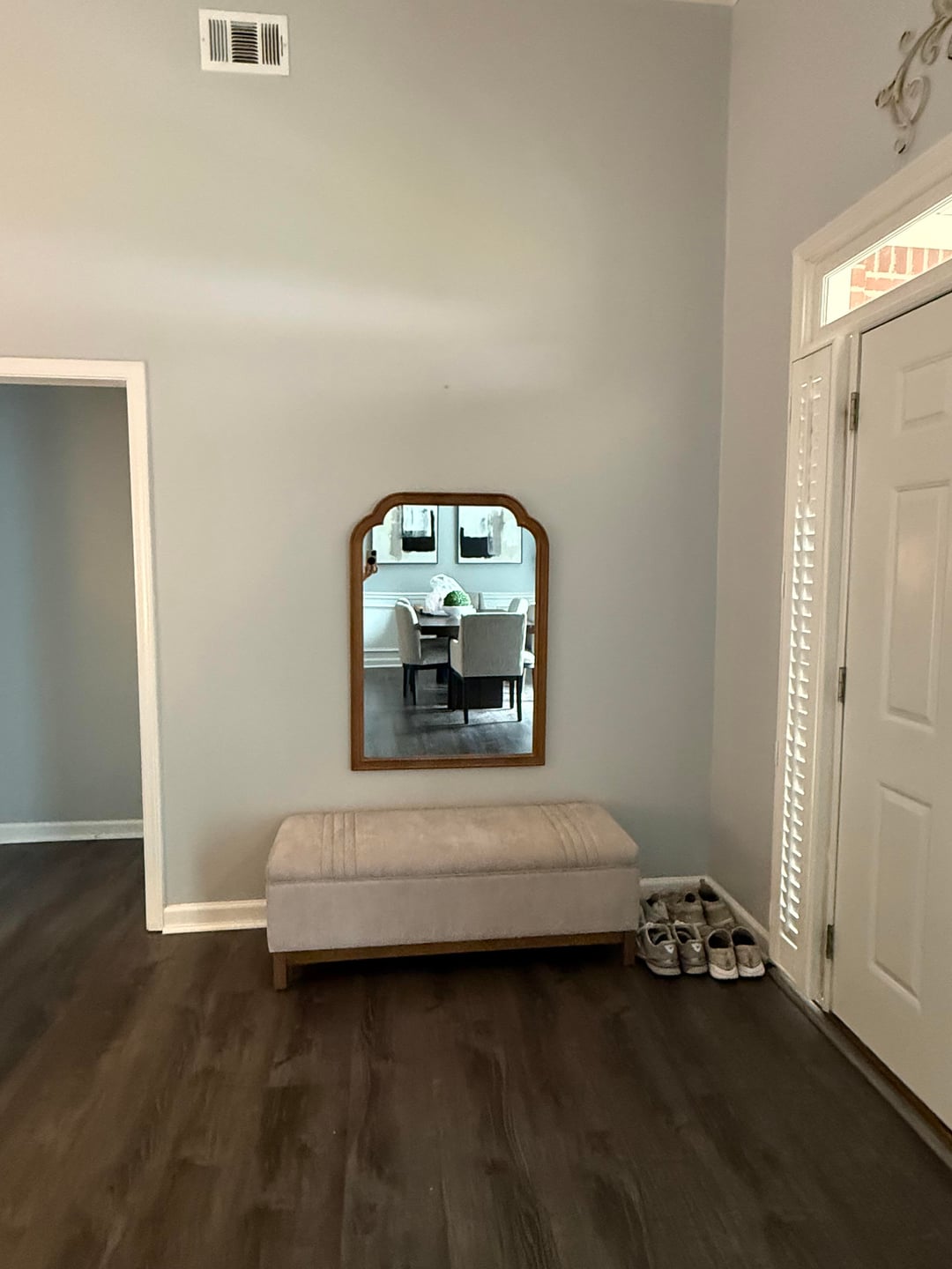 Entry: paint a warmer tone. The mirror is too low and looks awkward. This space needs an entryway rug. Again, get a shoe rack.