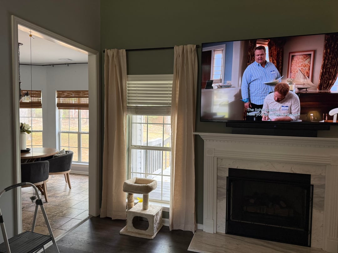 For the living room: The curtain height just feels weird & I can't pinpoint if they should go up or down. Unfortunately nothing I can do about the giant TV lol. The fireplace is also way too modern but unsure how to warm it up…