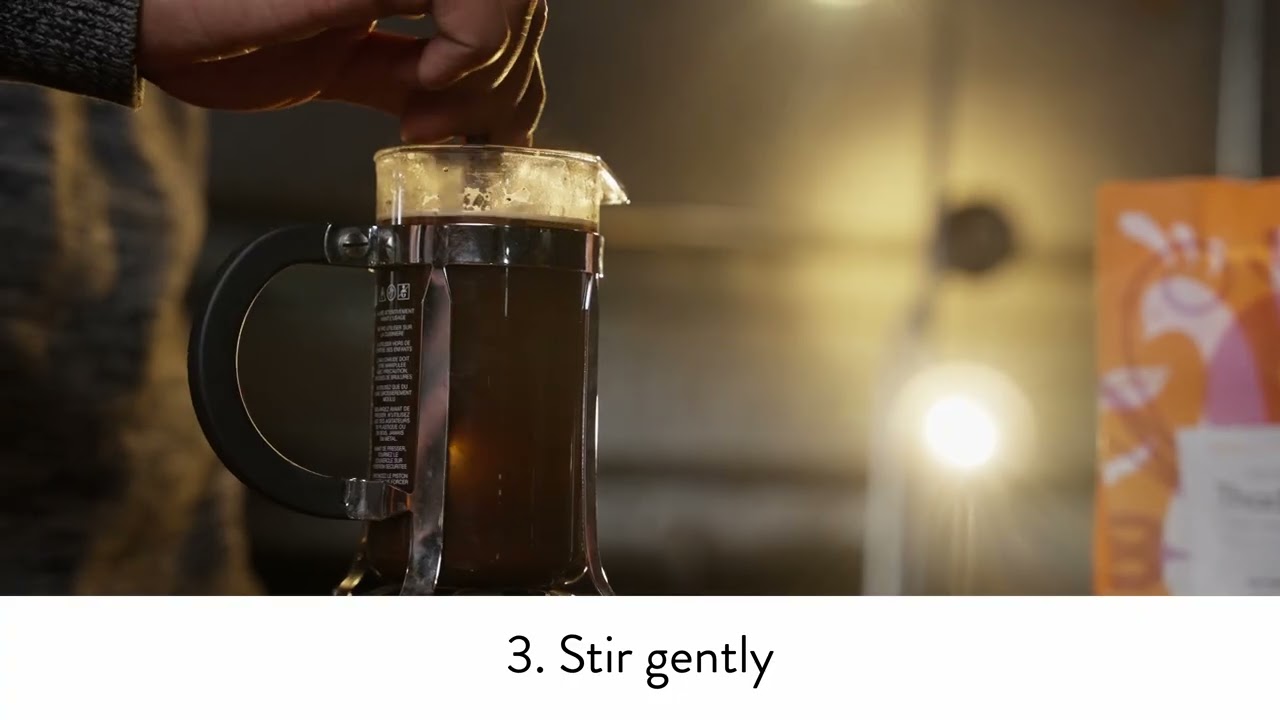 At the 4-minute mark, gently plunge just below the surface of the coffee.