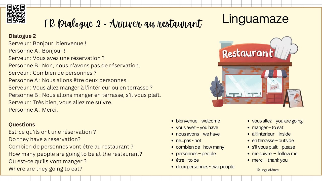 Practice beginner French with a simple restaurant dialogue about arriving at the restaurant, asking for a table, and choosing where to sit. Find printable dialogues, questions, and vocabulary at www.linguamaze.com . Arrivingbeginner french dialogue french conversation for beginners french food vocabularyCuisineDialogueDiningFranceFrenchfrench conversation for beginnersfrench cuisineFrench diningfrench restaurant dialogue french restaurant dialogue for beginners french ordering food vocabularyrestaurantVideoVlogYouTubeWrite A CommentYou must be logged in to post a comment.