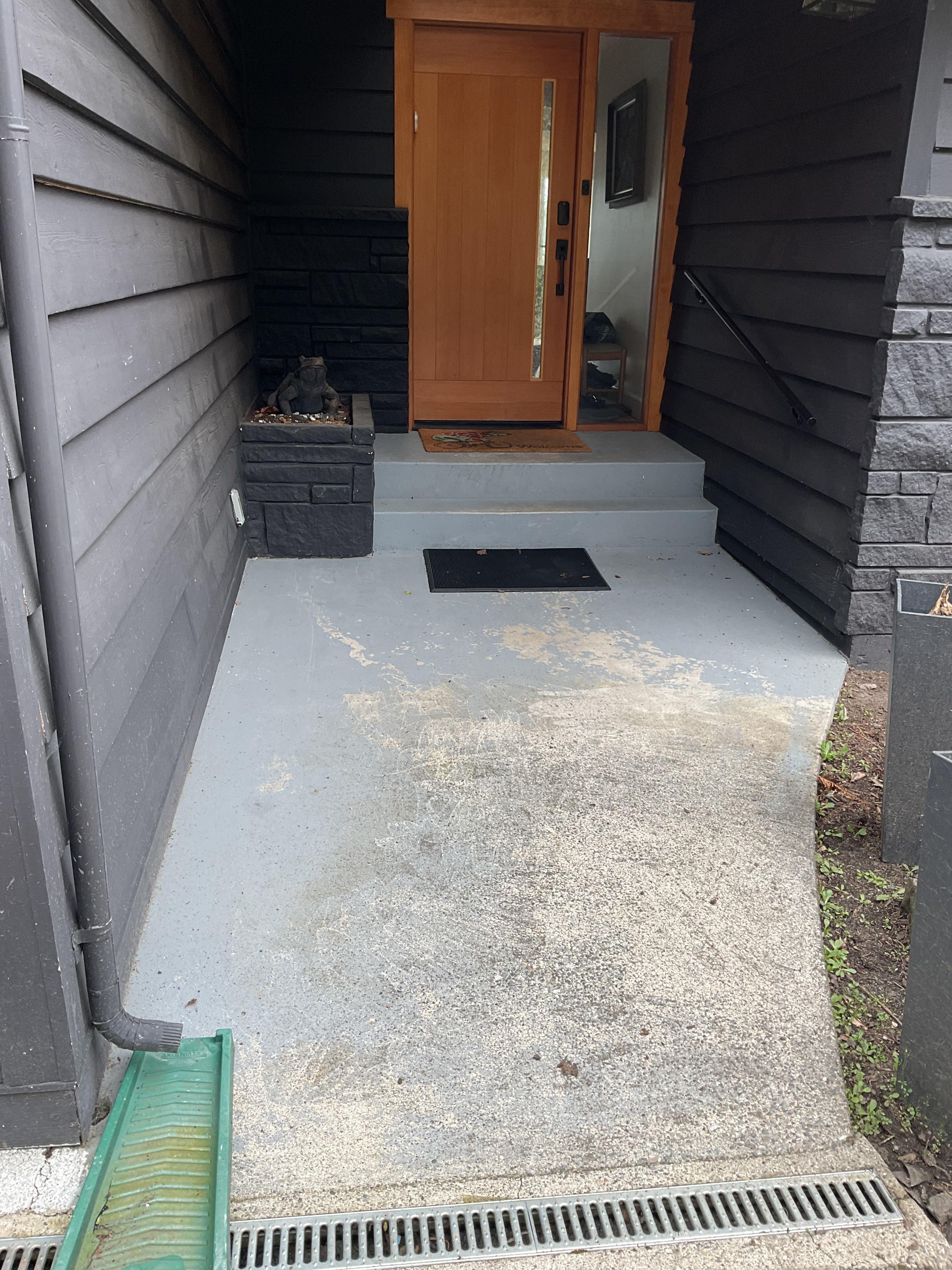 I’m trying to figure out what to do with this walkway. The paint is peeling so do I paint it? Epoxy? Add some stone? And what to do with the planter where I have a frog? It doesn’t get much light and never any rain.