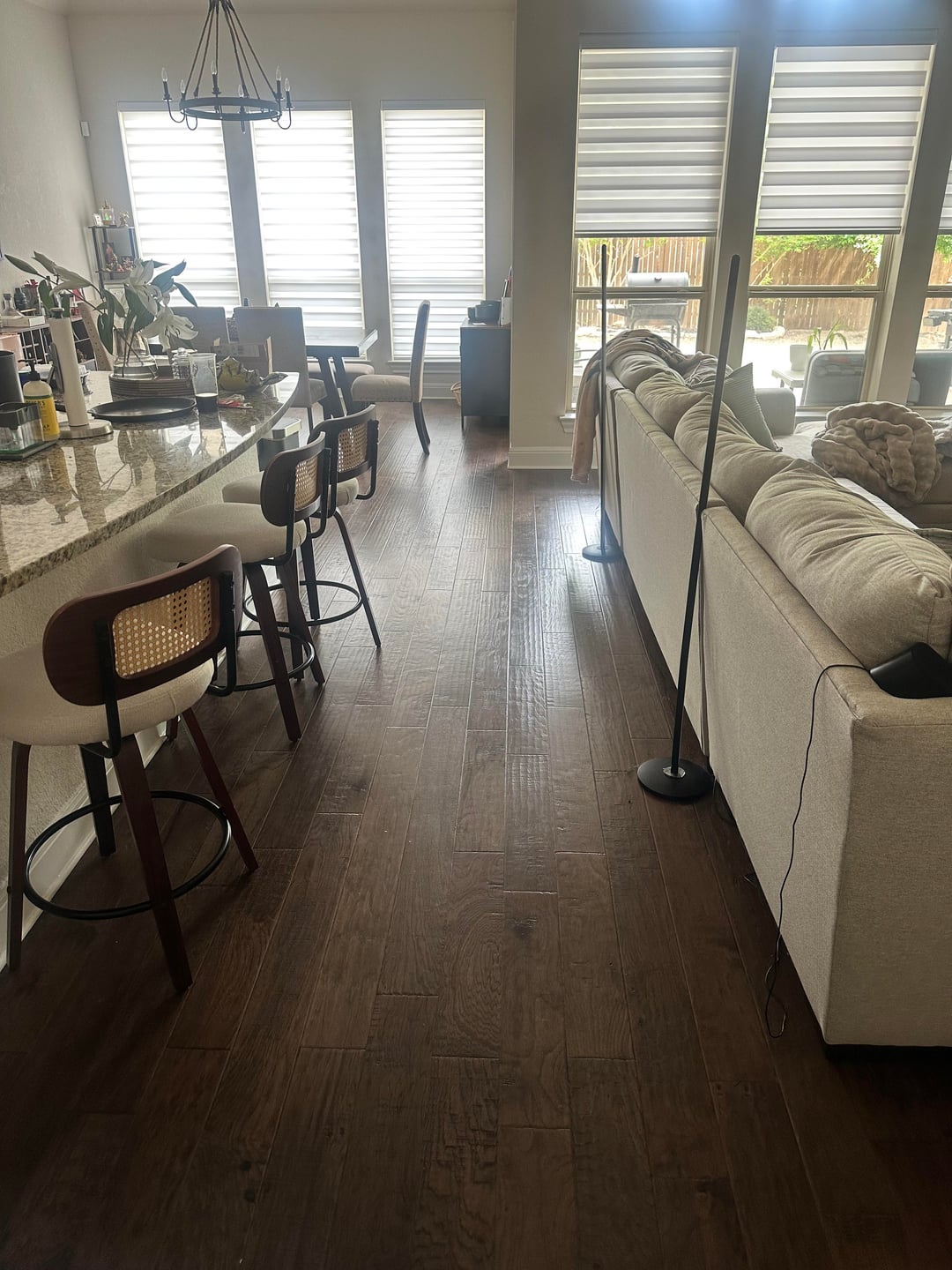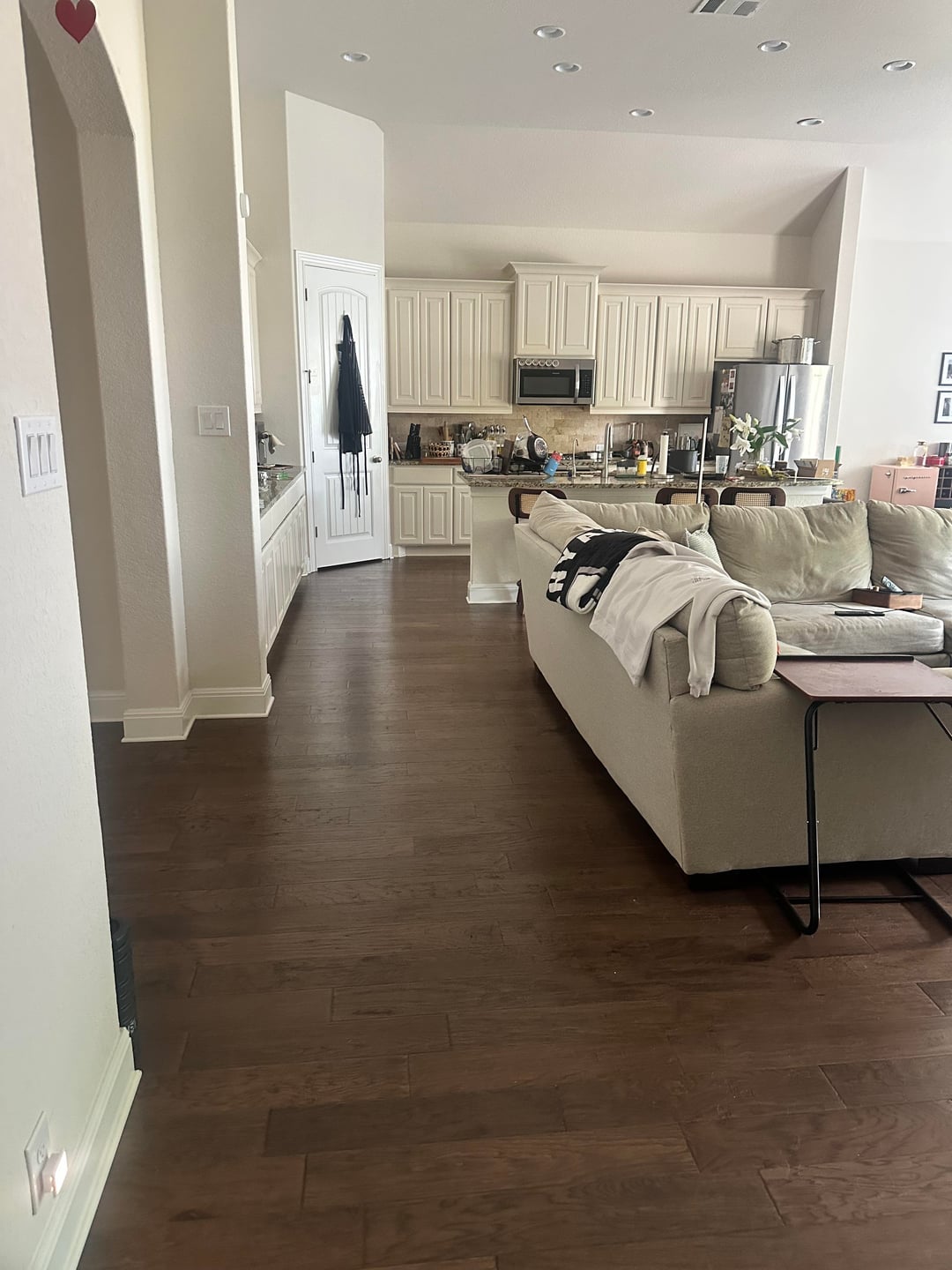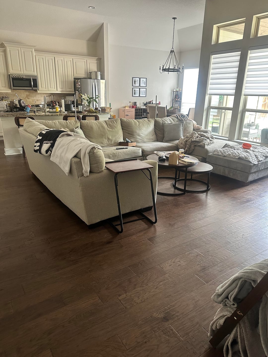 I think the couch is fine. Declutter if you can. Get rid of those small things end tables and the little things back in the kitchen dining area. Less is more with big furniture. It will look great but just keep it simple
