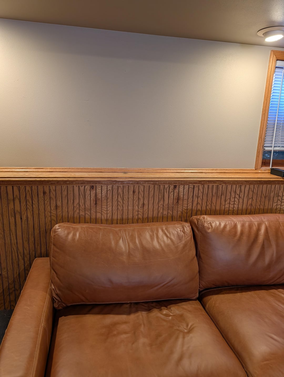 Painting is almost always the right call with this kind of paneling, especially since removal is off the table. A few things that might help narrow it down:Tony Taupe is warm, which works in your favor with honey oak trim – you’re not fighting a cool/warm war on the walls. I’d actually lean into that warmth with a coordinating color rather than going stark white, which can read as an awkward contrast.For darker basements, a mid-tone rather than very dark or very light usually works best. Something in the warm greige or soft sage family that’s a shade or two lighter than the taupe. The paneling grooves disappear when everything is painted the same color.The ledge is worth keeping. Painted in the same color as the panel, it reads as an intentional architectural detail rather than a dated afterthought. You can style it with a few pieces – pottery, a plant, something with some visual weight.If you do paint: prime first (essential with paneling), and use a satin or low-sheen finish. Semi-gloss will highlight every imperfection, flat won’t clean well.