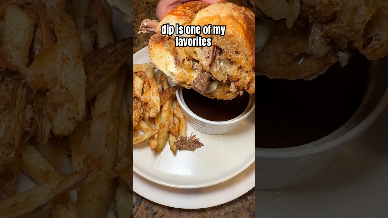 10. Assemble with sauce, shredded beef, and caramelized onions. Serve with au jus for dipping.