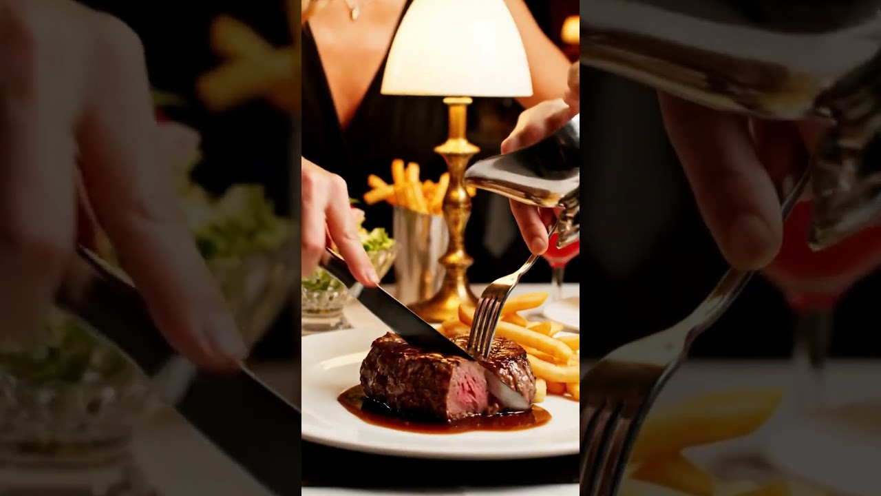The video captures a sophisticated dining experience , starting with a large, perfectly grilled steak on a white plate being placed on a table already filled with a variety of gourmet dishes. The table features several sides, including shrimp cocktails, french fries, and vibrant salads, along with cocktails and a small gold lamp that adds to the upscale ambiance.