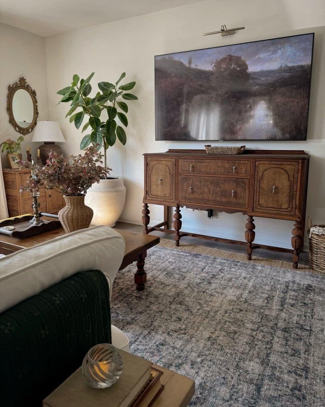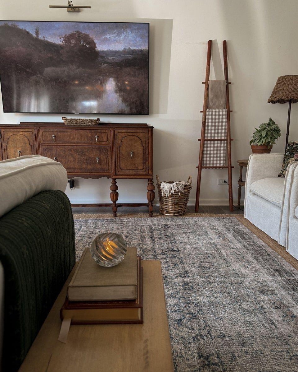 Try slowly curating things like the inspiration photos. Should be able to find a sideboard like that one relatively easily & they’re not too expensive depending on condition. The accessories can be collected over time at flea markets etc. In the meantime I agree the shelves are overwhelming, so removing them will lighten the space.🤍🪴