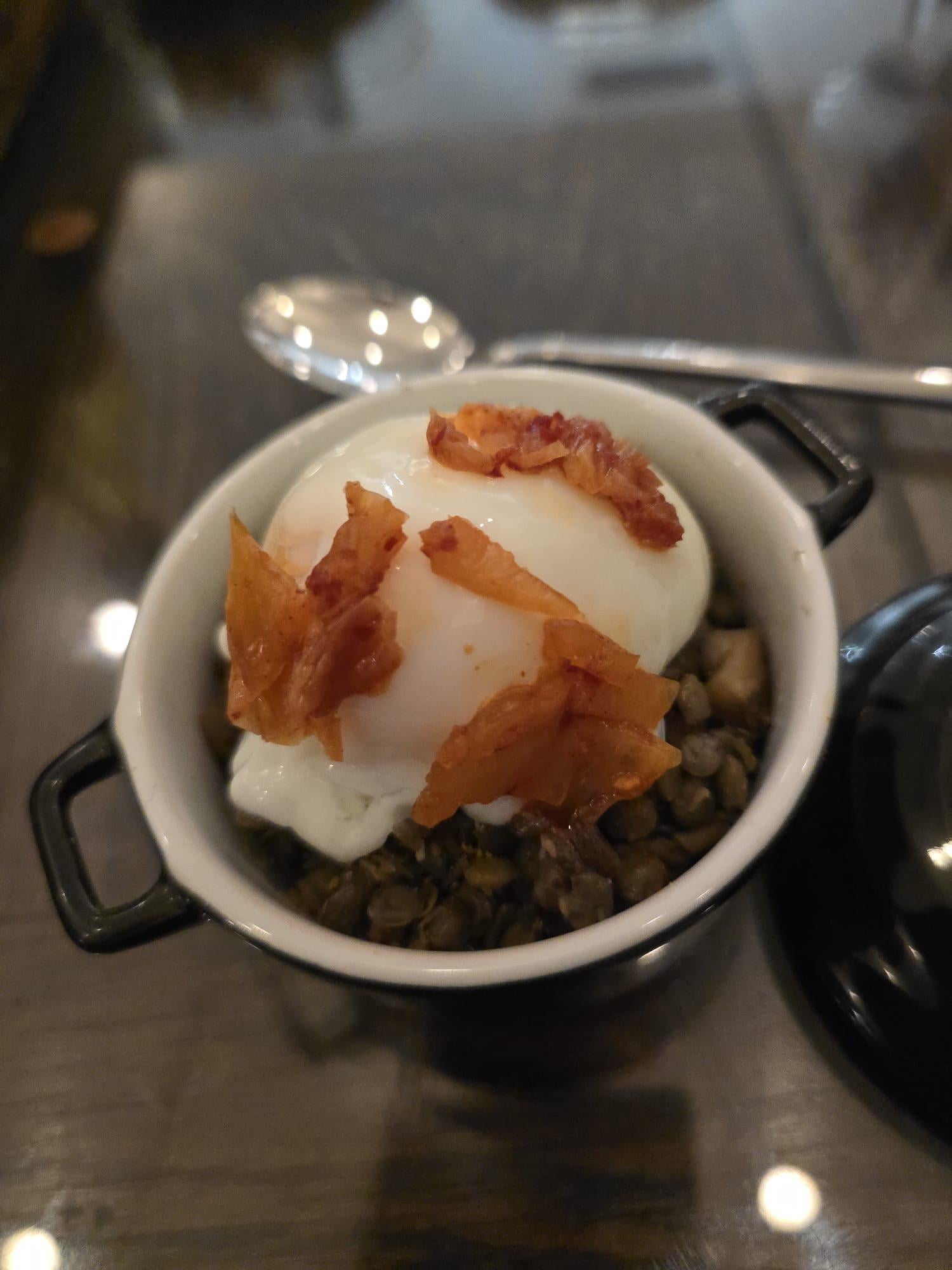 Lentille verte du cap mélangé avec du lard fumé et des pleurotes que l'on a fait cuire ensemble à feu doux pendant 1h pour avoir une belle réaction de maillard, avant de couper tout ça en petit dès et le mélanger aux lentilles.