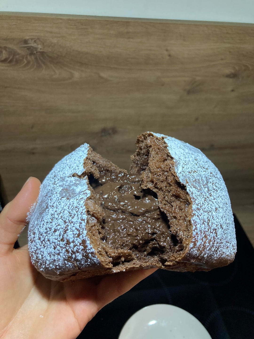 Je voulais que l’intérieur soit coulant comme dans la vidéo mais ca ressemblait plus à de la crème pâtissière au chocolat. J’essayerai de réduire la maizena ou de réduire le temps de cuisson de la crème la prochaine fois.
