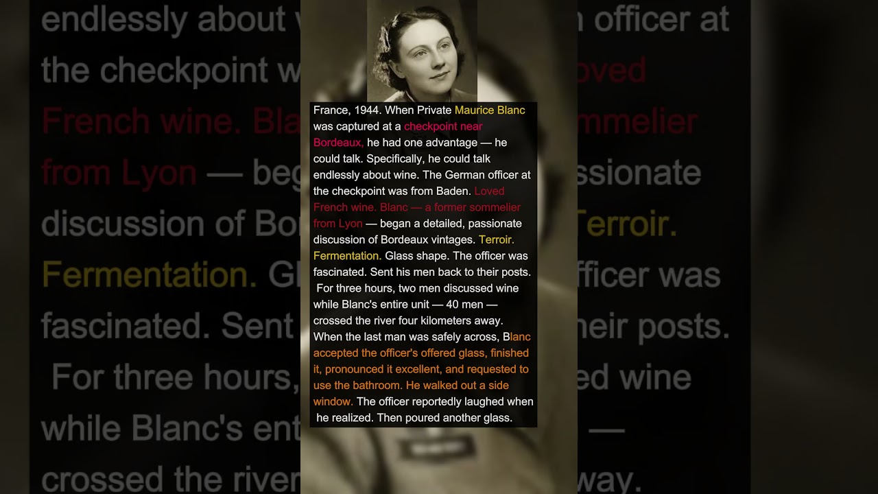France, 1944. When Private Maurice Blanc was captured at a checkpoint near Bordeaux, he had one advantage — he could talk. Specifically, he could talk endlessly about wine. The German officer at the checkpoint was from Baden. Loved French wine. Blanc — a former sommelier from Lyon — began a detailed, passionate discussion of Bordeaux vintages. Terroir. Fermentation. Glass shape. The officer was fascinated. Sent his men back to their posts. For three hours, two men discussed wine while Blanc’s entire unit — 40 men — crossed the river four kilometers away. When the last man was safely across, Blanc accepted the officer’s offered glass, finished it, pronounced it excellent, and requested to use the bathroom. He walked out a side window. The officer reportedly laughed when he realized. Then poured another glass.