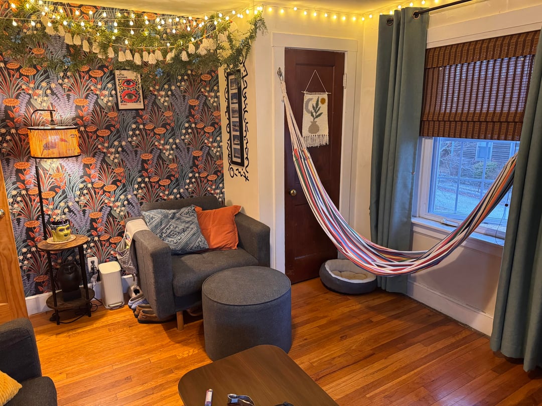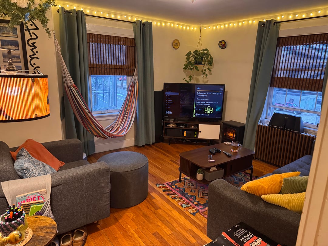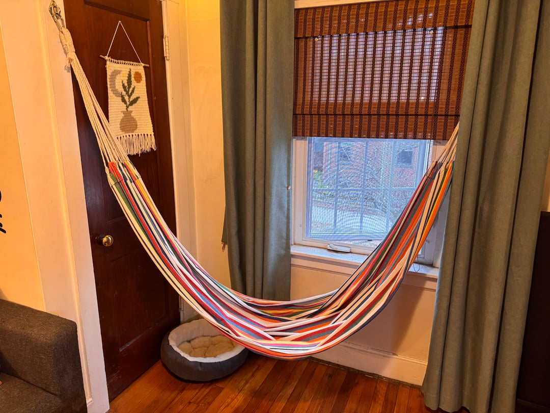 We have a smaller 2-bedroom in a hundred year old building so all the rooms are on the smaller side. We often have friends over, usually 3 to 6 people and seating runs out fast. Between the couch, chair, and ottoman we have 5 spots – the hammock makes 6. We’ve had it up for a couple weeks and I love it! My wife says it’s weird and doesn’t work in the space. What say you?