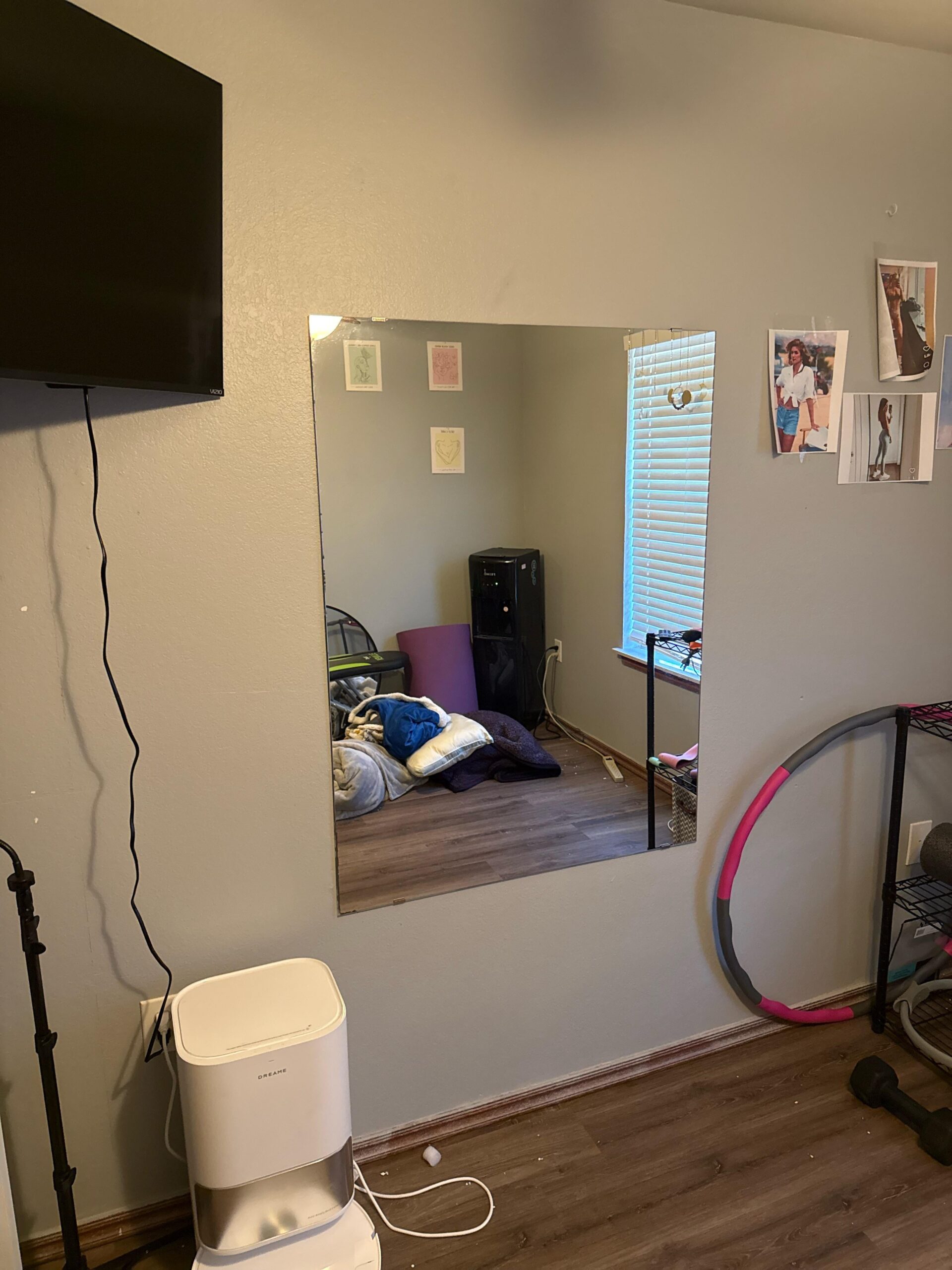 Hide the tv cord with a cord cover or just pin it in the corner, build a frame around the mirror, maybe incorporate lights in the back of it, and frame the pictures on the wall, and hang the hula hoop along with a few other items maybe from hooks on the wall.
