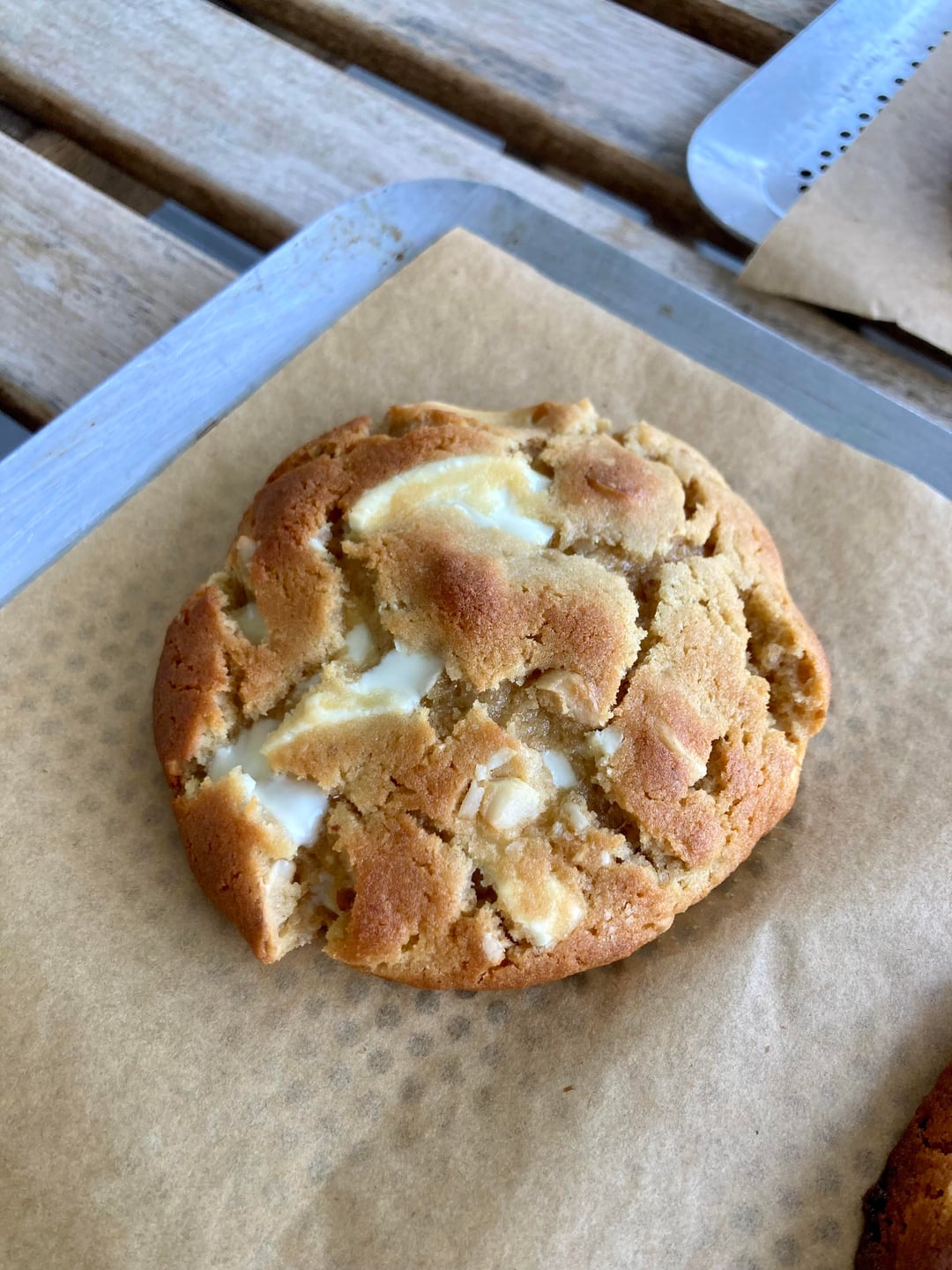 Fouetter le beurre et les sucres très vigoureusement jusqu’à obtenir une texture crémeuse. Ajouter les œufs, fouetter à nouveau, ajouter la pâte de miso, puis fouetter encore. Ajouter la levure chimique, le bicarbonate et la fécule de maïs, puis fouetter (encore). Ajouter le chocolat et les noix de macadamia (froides). Ajouter la farine et mélanger jusqu’à ce que la pâte soit homogène. Mettre au frais pendant une heure (ou toute une nuit) avant de former des palets de 80 g. Réfrigérer à nouveau jusqu’à ce qu’ils soient bien froids.