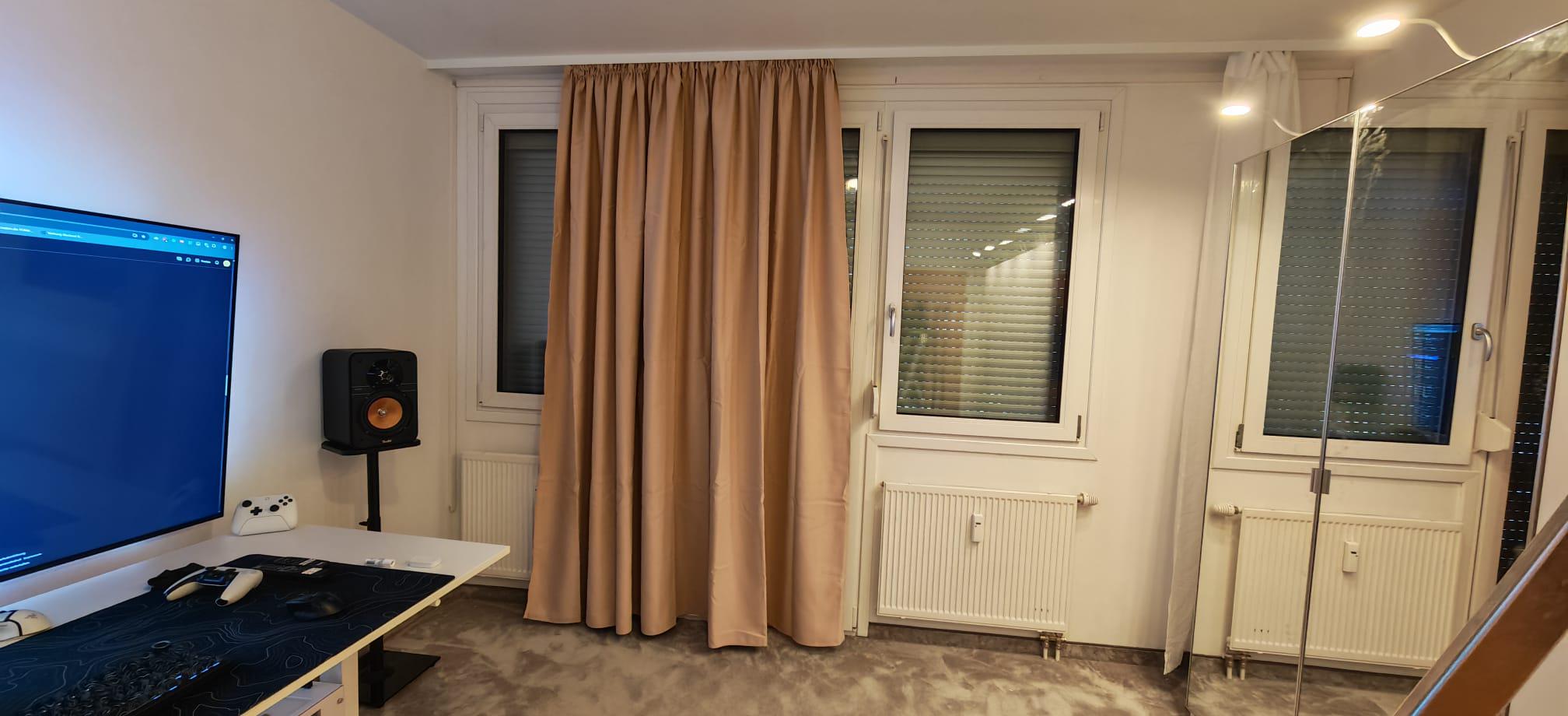 i like how that color coordinates with the gold rim of your speakers. i think an entire wall of that would be really nice. do you use RGB lighting in that room? having one colored light on one side and a different colored light on the opposite would create some really neat shadows