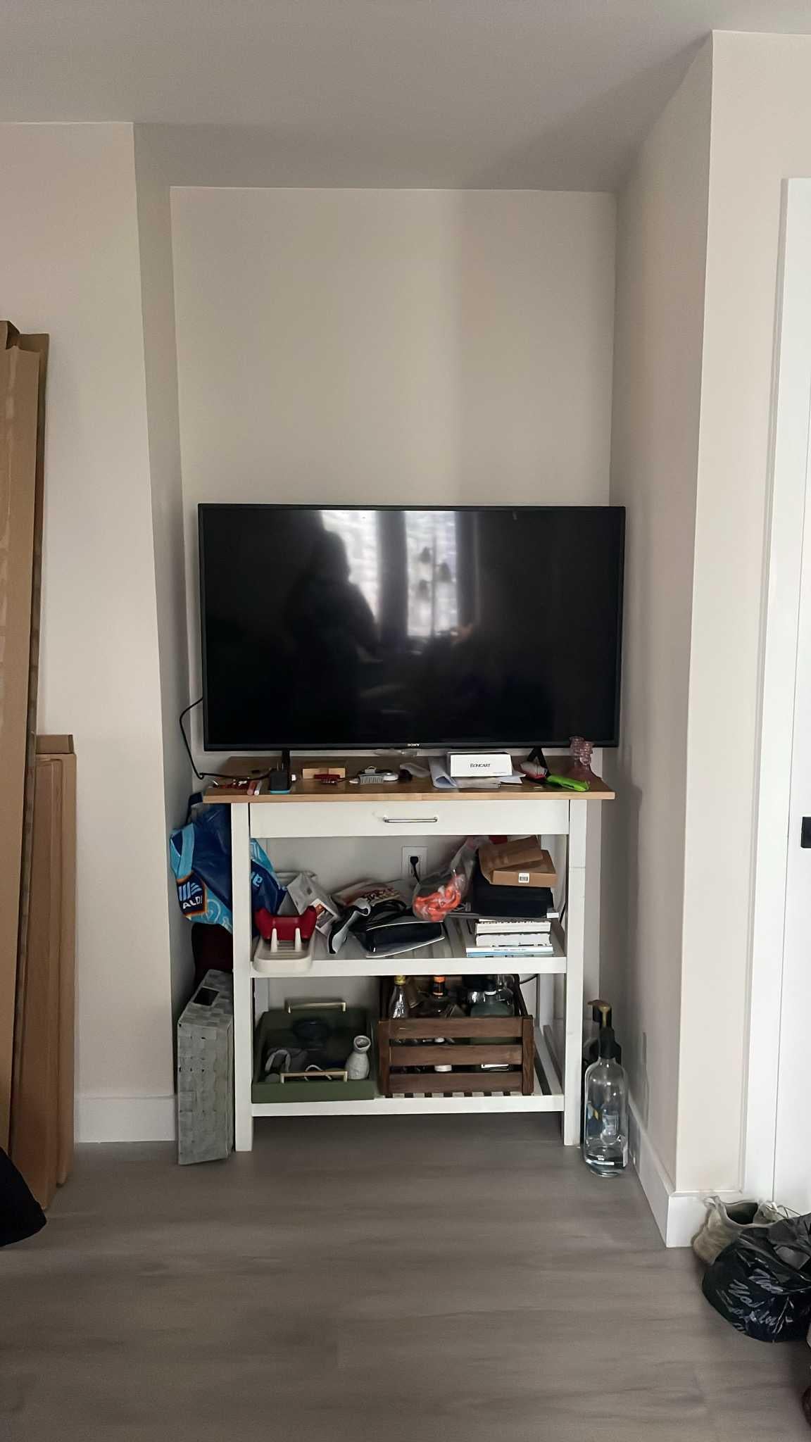 Just moved and can't figure out what to do with this space. Measurements 47" by around 1' on one side and 2" on the other. Happy to either mount the TV or have it on some sort of cabinet. Thank youuu