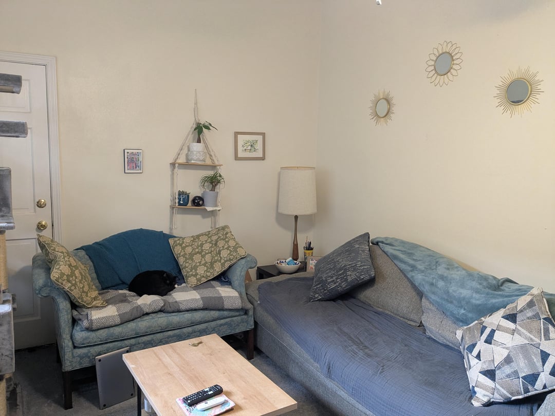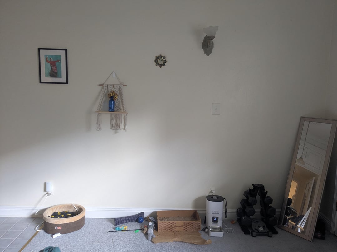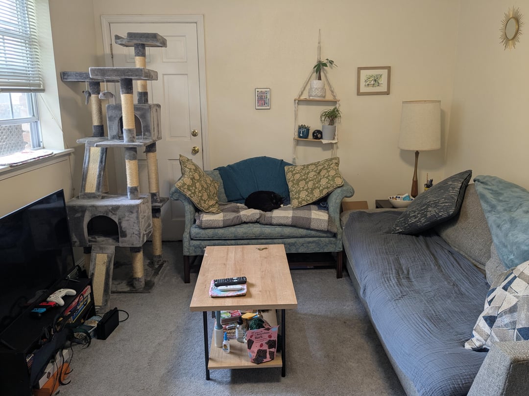 Hi, I'm seeking advice on how to make the living room space of my apartment look more appealing. Some ideas I had were changing the blanket the cat is sleeping on to something that fits better with the pattern (she likes to take her baths there so needs some covering) and getting a cabinet storage for the exercise equipment and some of the cat toys. I can't paint the walls or make drastic changes. I was afraid to put too many nails in the wall for awhile but I'm over that now so also want to put up more art.