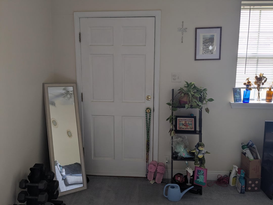 You’ve got quite a lot of stuff on the floor, which tells me you need more storage. Just picking up all the errant toys, spray bottles, and other small things will make your space look significantly better. You should also wall mount that mirror by your front door so that it’s not just propped up.