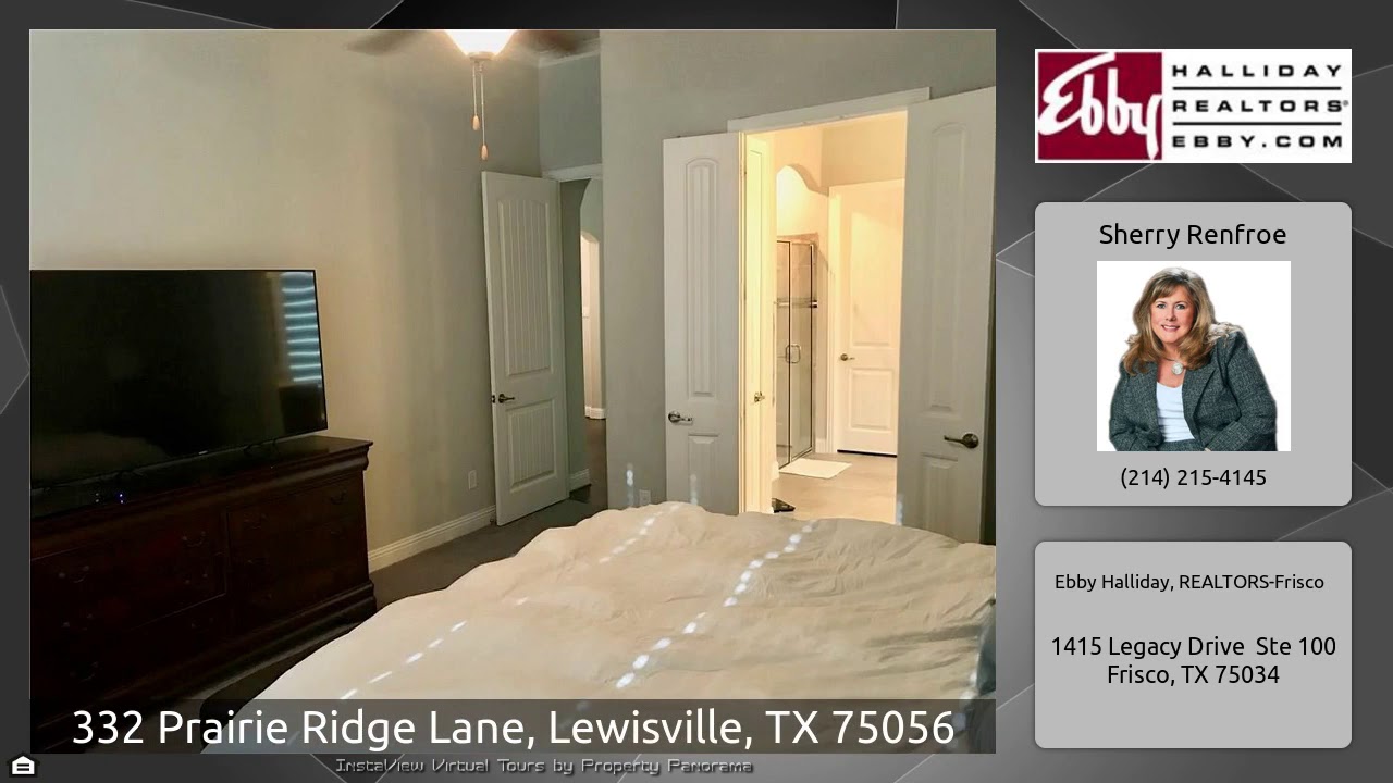 The Virtual Tour for the property at 332 Prairie Ridge Lane, Lewisville, TX 75056 listed for $2,700: Other homes for sale by Sherry Renfroe of Ebby Halliday, REALTORS-Frisco: PRACTICALLY NEW! Beautiful hardwood floors on first floor, high ceilings, sep office with french doors, formal dining rm, open kitchen, granite counters, gas cooktop, DOUBLE OVENS, eat at island and spacious breakfast nook all open to the family rm. Large master w high ceilings, master bath has sep vanities, great shower and walk in closet. Upstairs secondary bedrooms are a great size, full bathroom, big game room and …