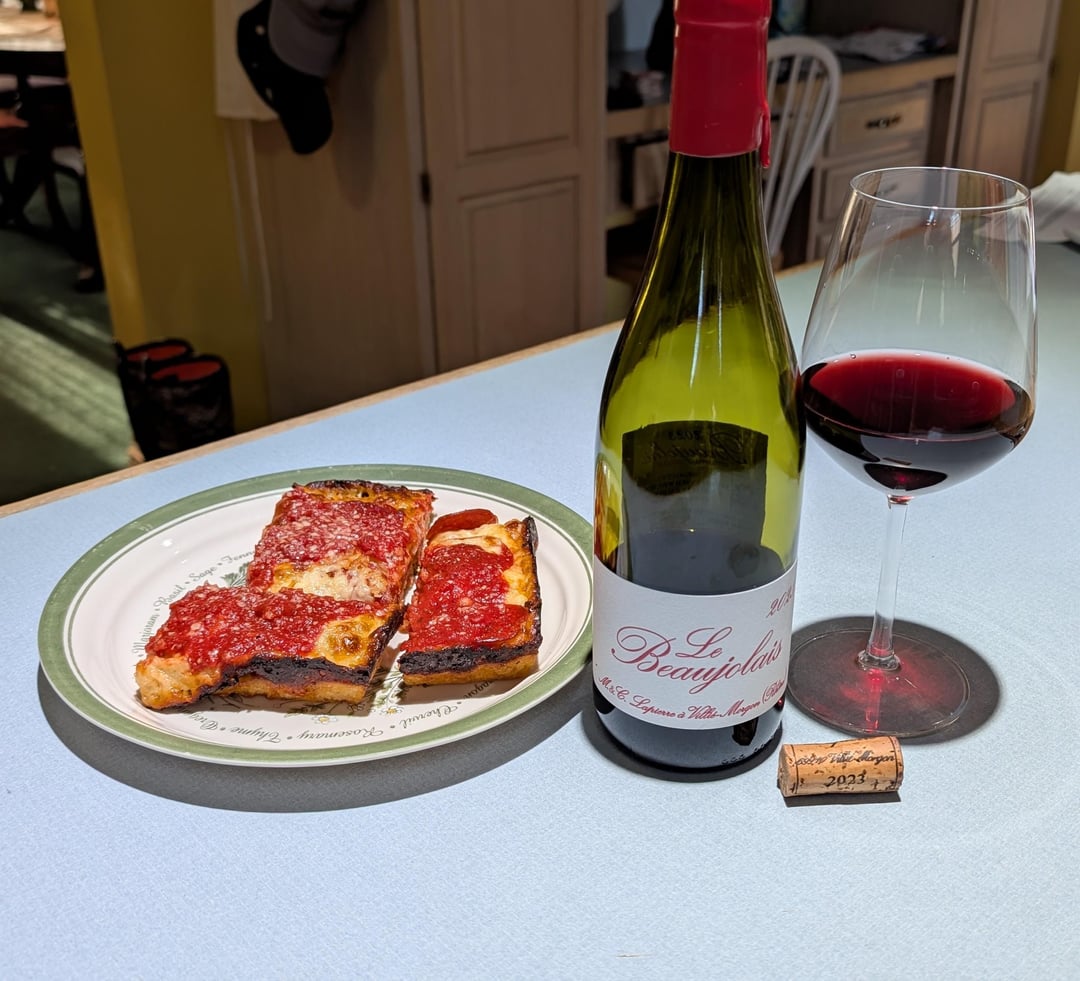 We had the best Detroit Style pizza I’ve had outside of Detroit itself. I grew up on “square pizzas” and this little place in Traverse City, Michigan called Charles & Reid. And since I didn’t have any Zinfandels at hand, I decided to pair that with a bottle of 2023 Marcel Lapierre Le Beaujolais.