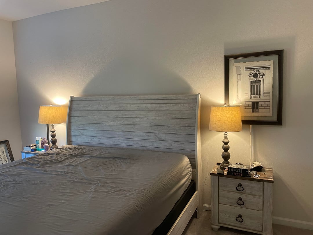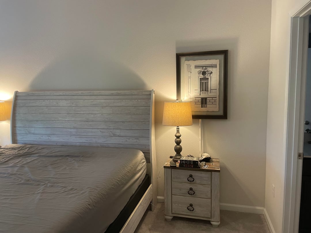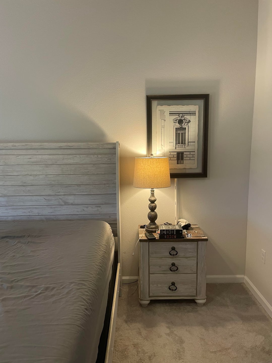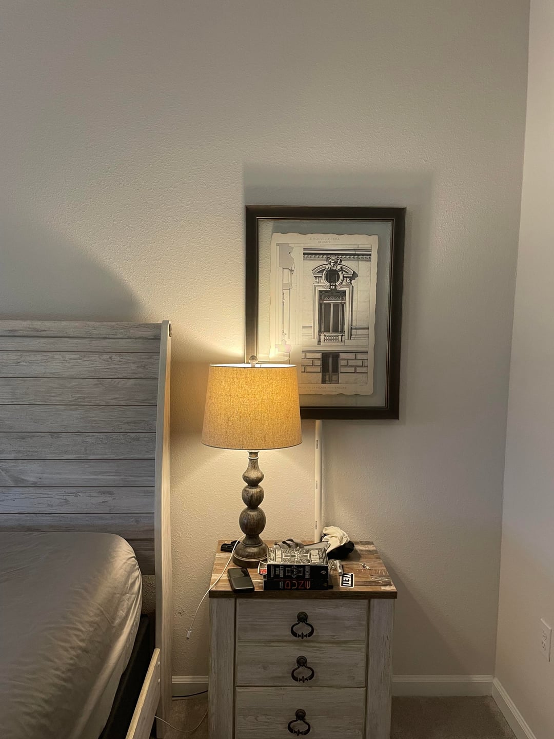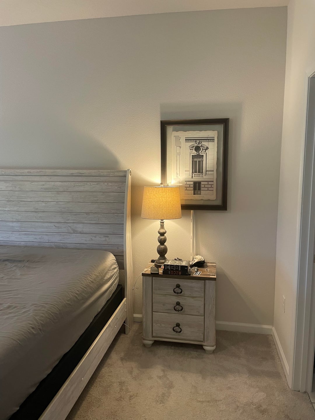 It feels too high and too large in comparison to the night stand. Maybe you could have some art above the headboard instead or just go without it!