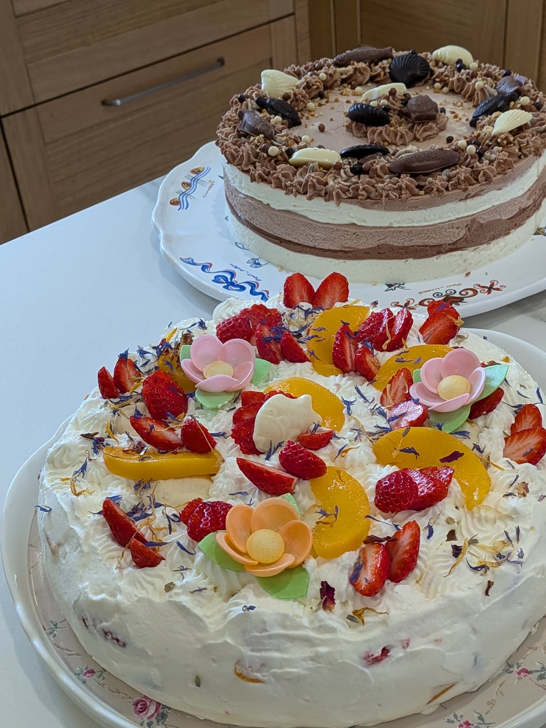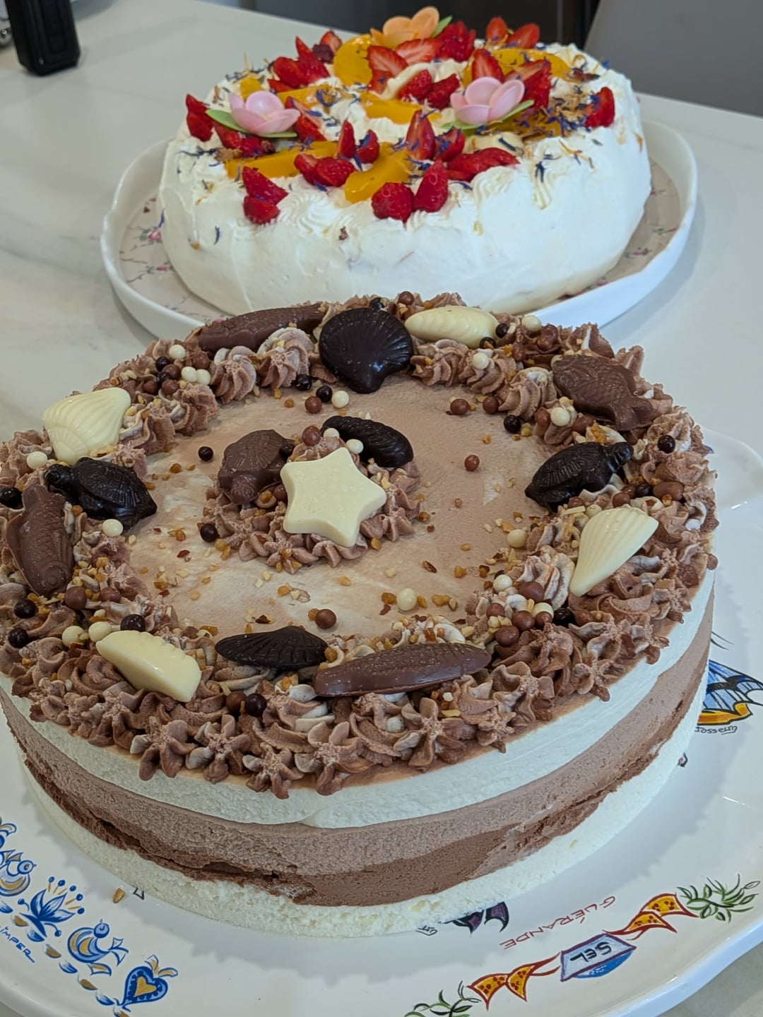 Trois chocolats avec un croustillant dulcey et une dacquoise amandes-noisettes au premier plan, gâteau à la crème et aux fruits (fraises fraîches et pêches au sirop) avec pour biscuit une meringue à la violette couverte de chocolat blanc, derrière