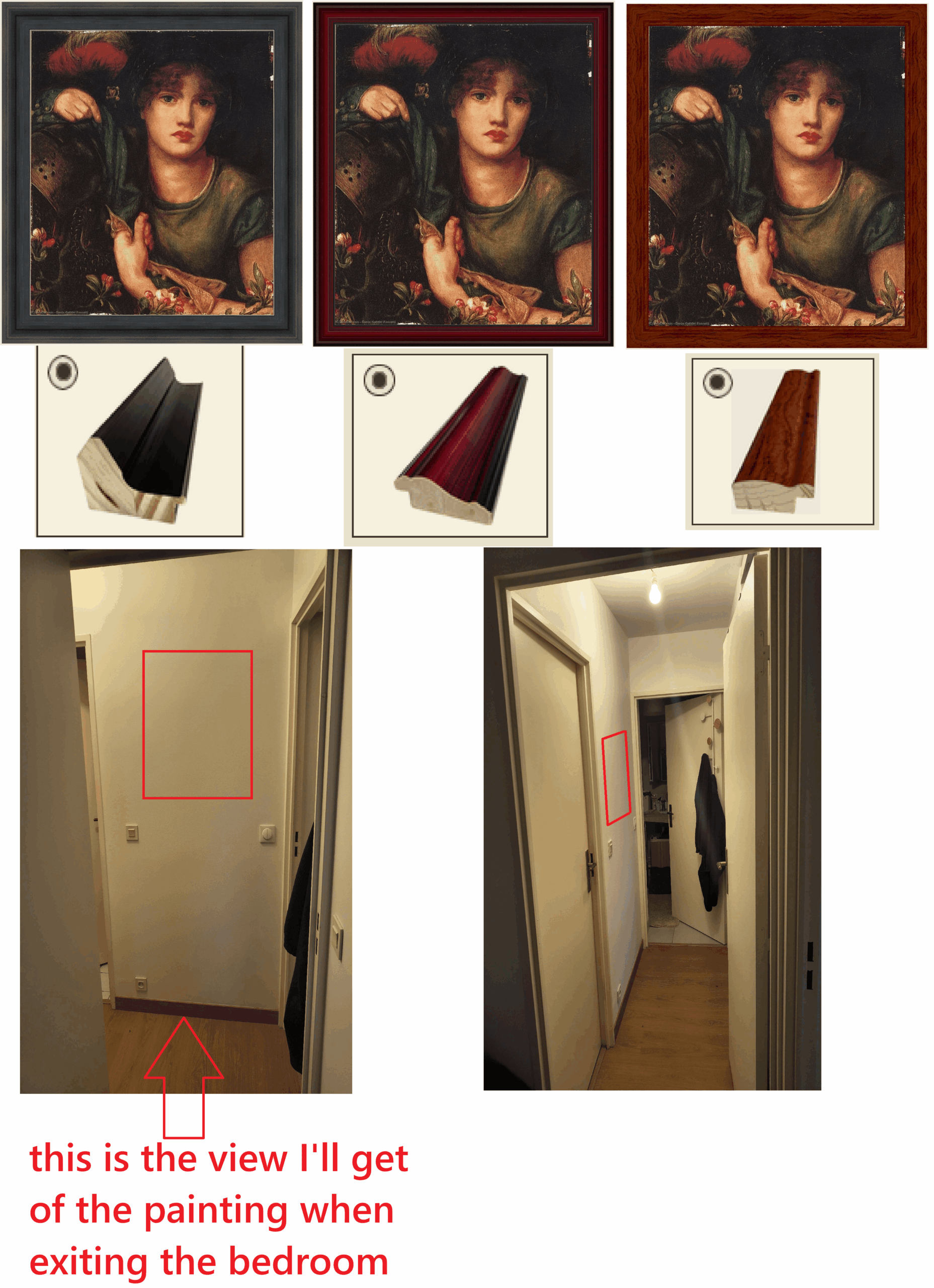 I added some pictures of where the painting will be. It's a rather dark place, not much natural light. Also it will be the first thing I see in the morning when I get out of my bedroom so it needs to make me happy.by Physical_planning home and gardenhome decoratinghome decorating ideas 4 Comments hoohooponoponopono 2 hours ago 2.Can you do anything about the light “fixture”? OrneryLavishness9666 2 hours ago 2 or 3. I like 3 best. crazycockerels 2 hours ago I like frame 1 londuc 2 hours ago 1. Doesn’t compete with the colors of the person, draws your eye to them.Write A CommentYou must be logged in to post a comment.