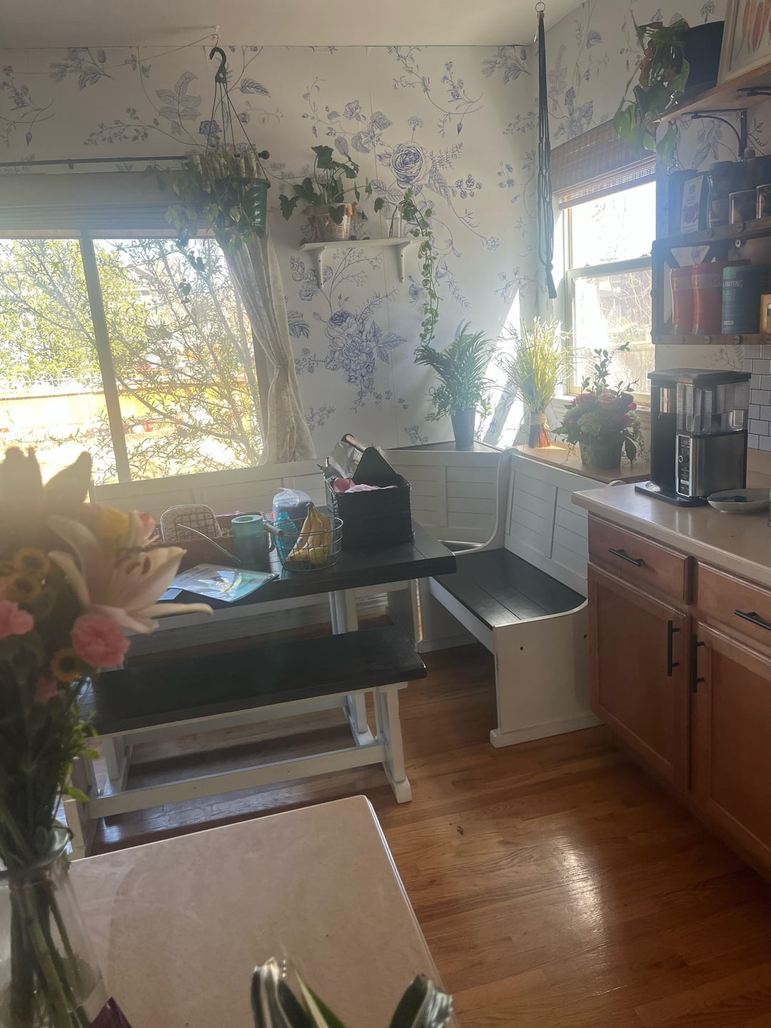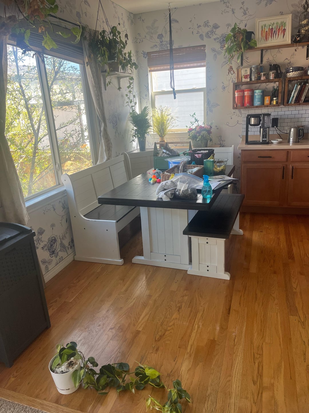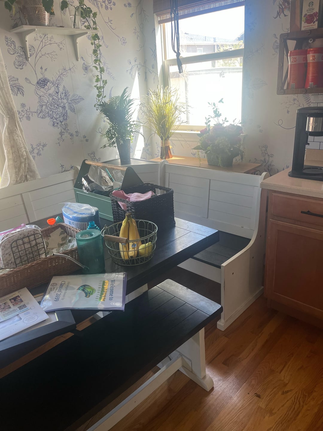 We have this corner breakfast nook table and we have been trying to decide how to fit it. We have tried a few spacing options including changing the corner piece to the other side but we can't decide if we like it. Please ignore the stuff on our table, we're cleaning/organizing.