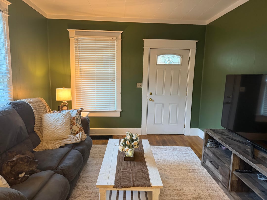So, I initially felt so disheartened by the color of this room that I worked so hard to paint. It just wasn’t how I imagined. So, I went to a couple subreddits for suggestions. I got rid of the darker decor, rug, etc, and swapped it out for lighter/more neutral tones. Unfortunately, replacing the furniture isn’t really an option right now. HOWEVER, I have ordered more decor, a tall plant, and some wall art. Even a floor lamp (with shelves, yay!) Thanks again, guys!