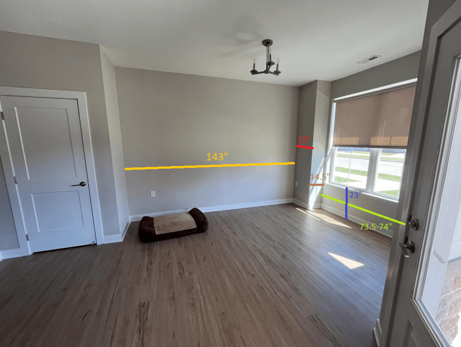 This room is probably intended to be a dining room or something, but I'd like to put a comfy seating area for reading and a cushioned bench for my dogs under the window so they can look out.