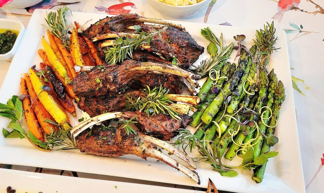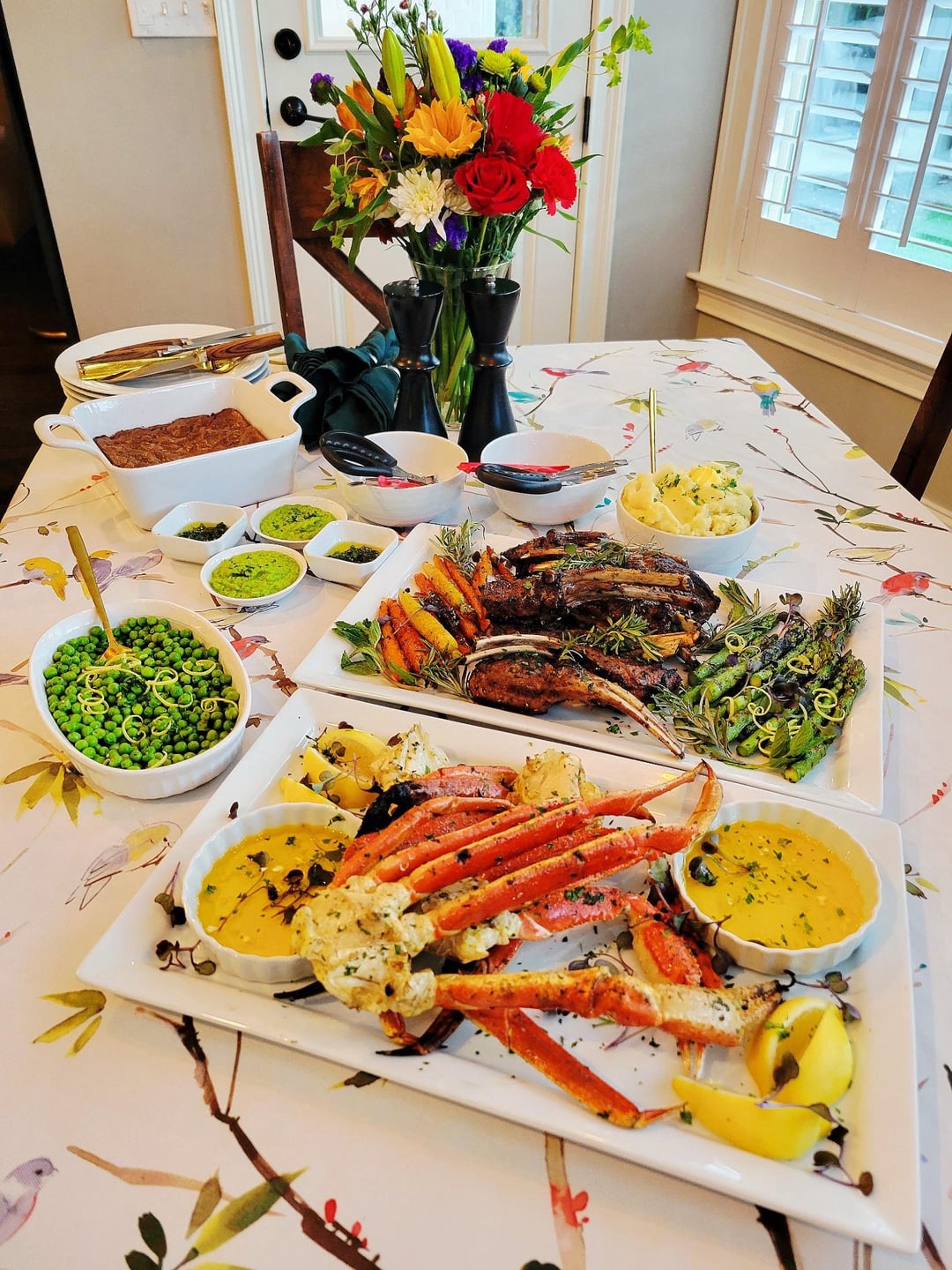 Dinner: Grilled lamb chops with Italian gremolata, pea and mint puree, peach preserves roasted carrots, grilled asparagus and Yukon gold mash. Snow crab and butter. Wife did an amazing job!