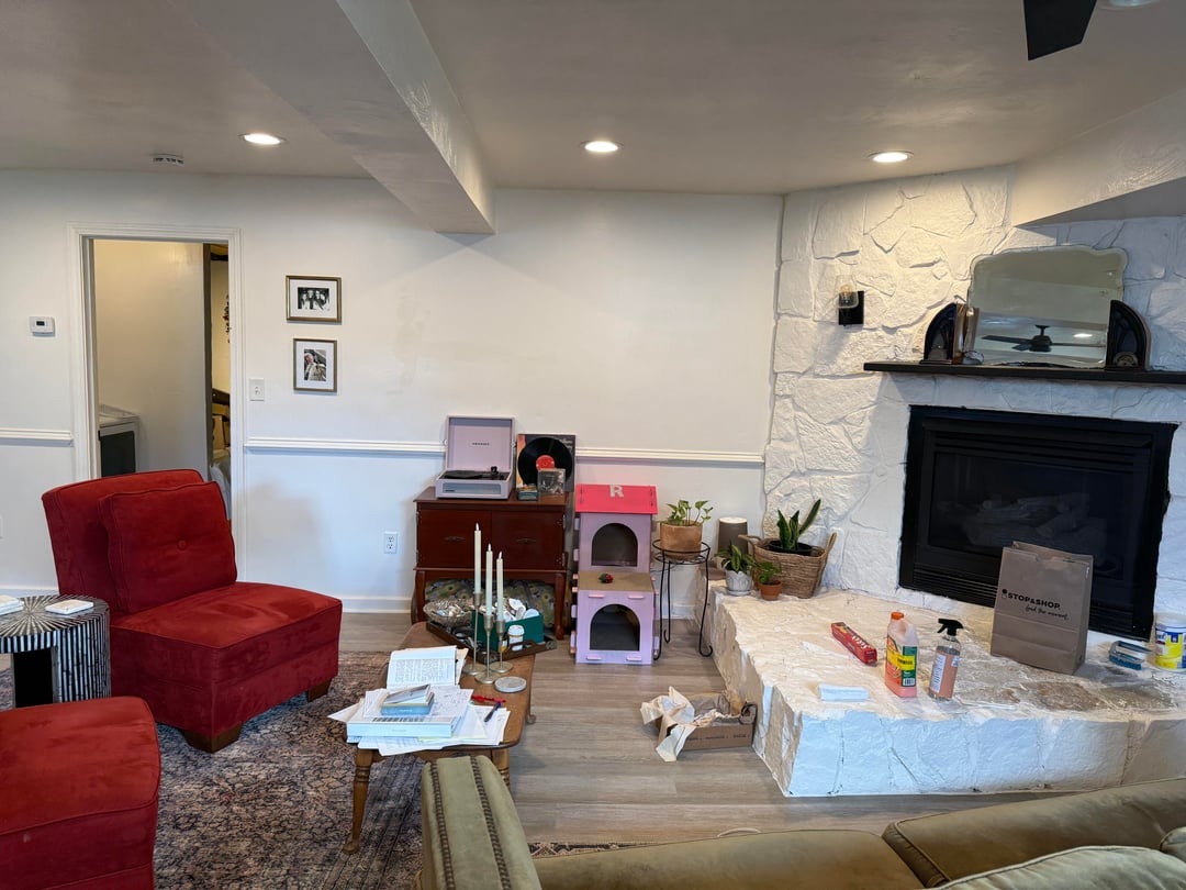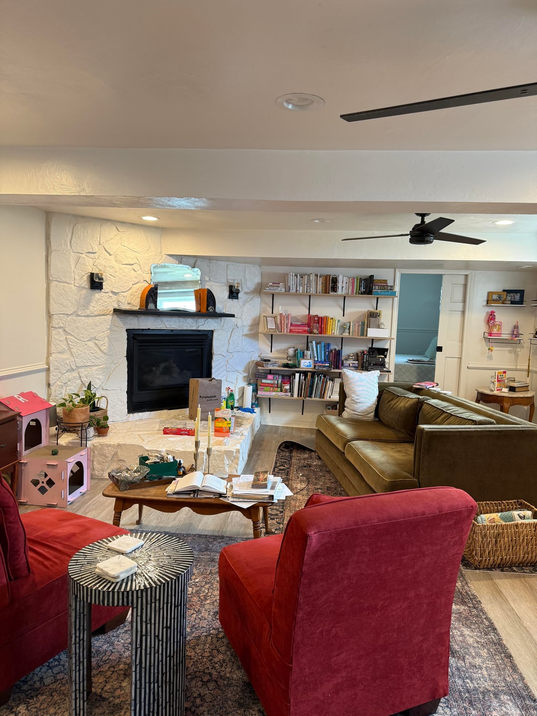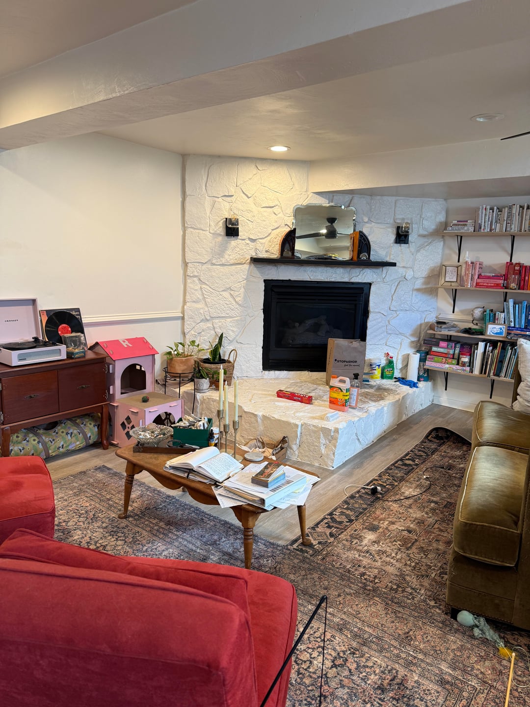 – I tried a couple other layouts, but this one made the most sense. My Uncle plans to fix/replace the fireplace soon, and once I remove the paint from the hearth, and bulk up the mantle shelf, the fireplace will be the focal point of the room, so I don't want the couch to have it's back to the fireplace.