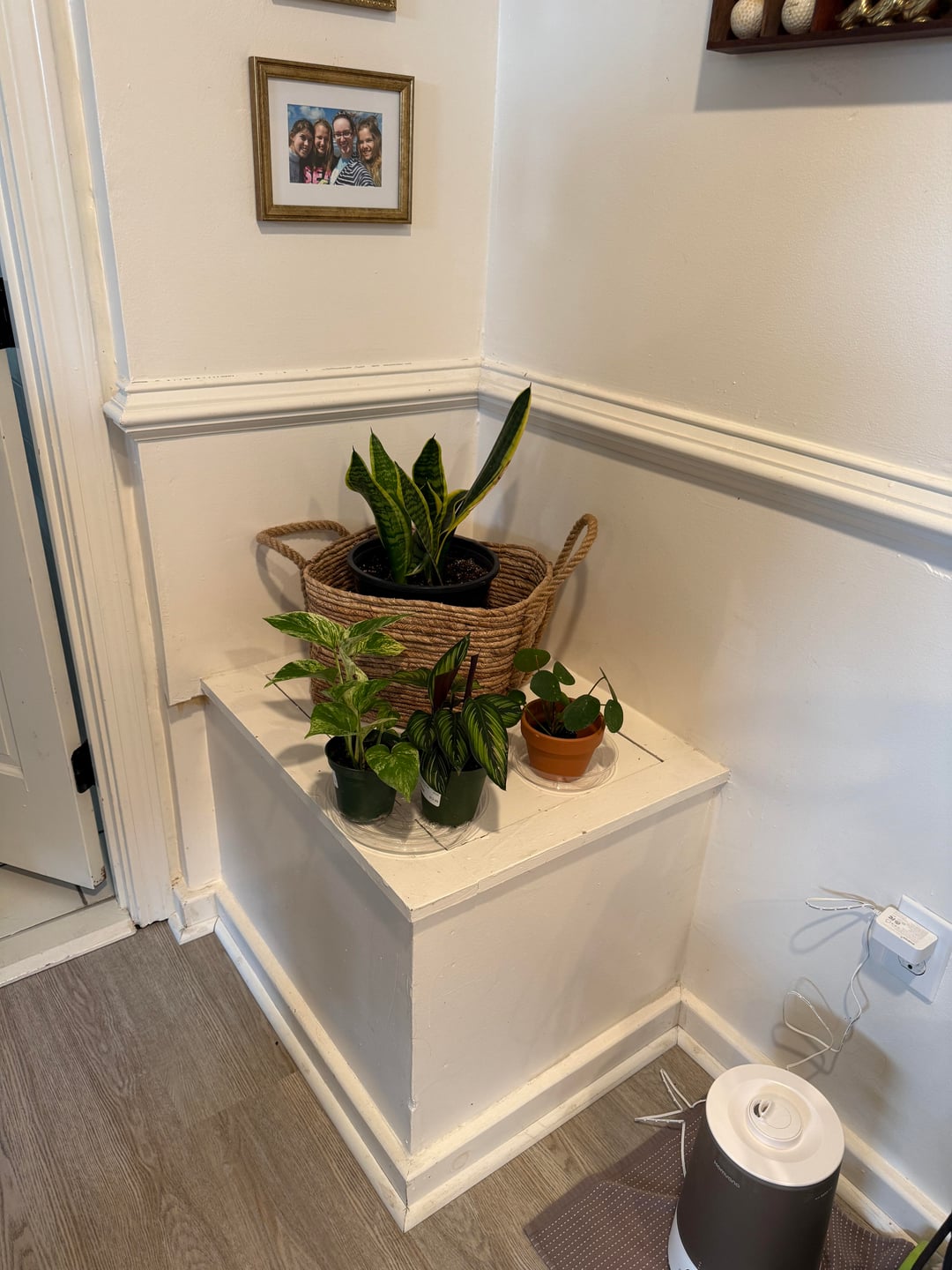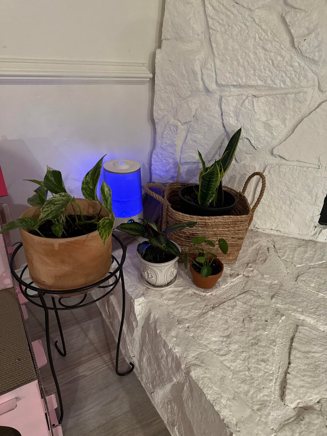 I moved my plants from the sump-pump cover box (oh the joys of living in a New England basement) to the hearth, and am trying to determine if I need to get a grow light. They are all plants that thrive in indirect light, so I'm going to wait and see how they do in this new spot before I invest in one.