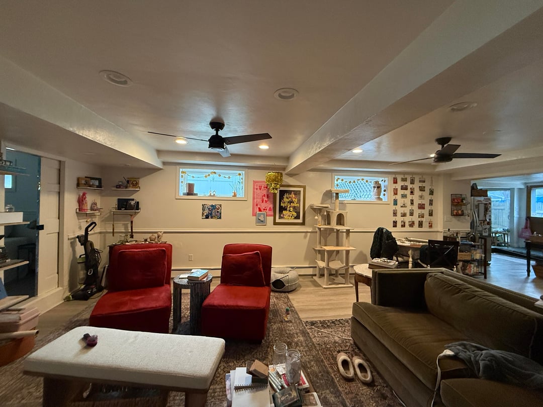 - I also plan to add more bookshelves to the left side to balance that out visually and anchor the space. (I might adjust the bookshelves on the right and end up moving two of them to the left, and then add closed cupboard space underneath for more hidden storage options.