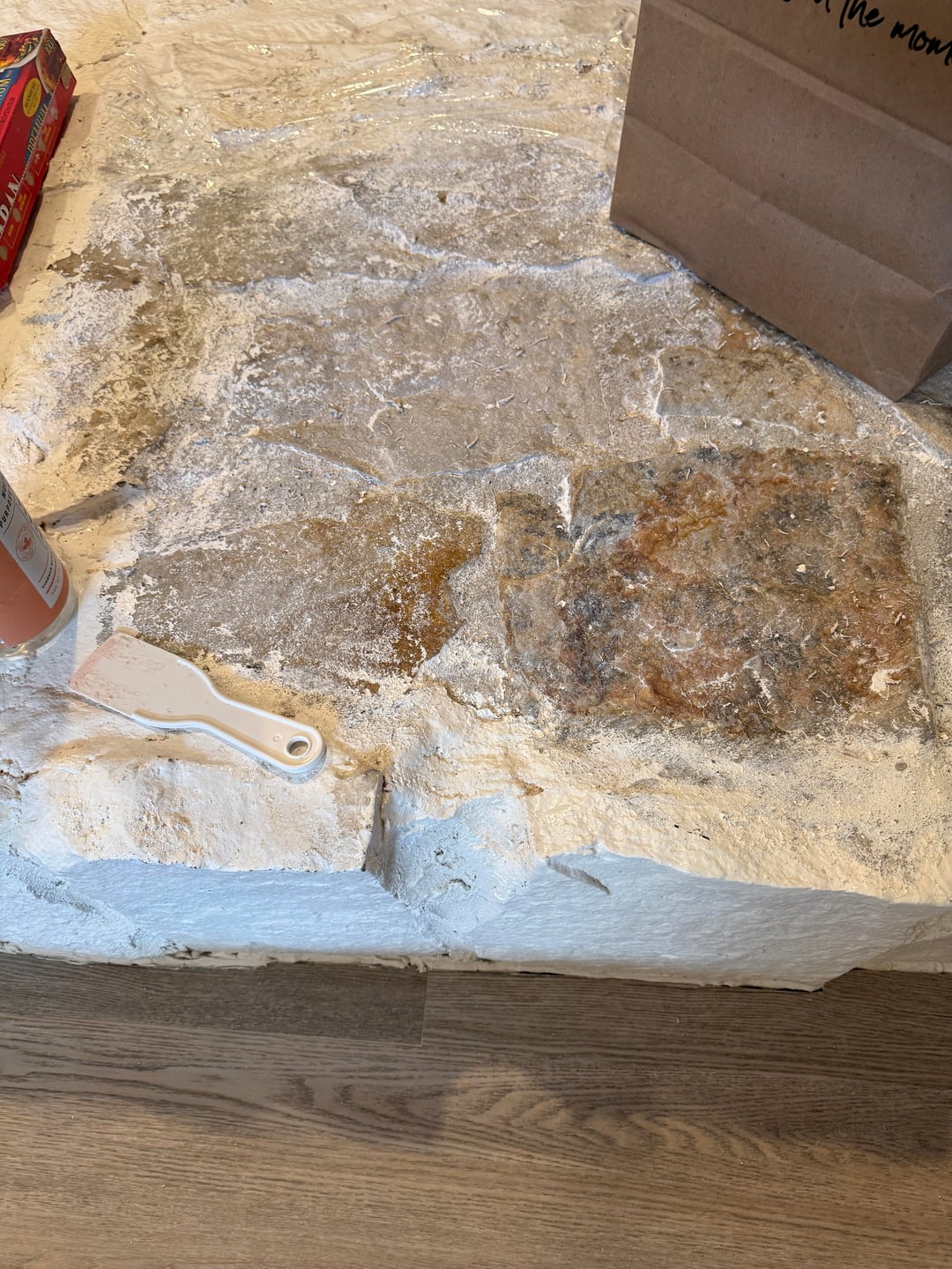 I've started the process of citra-strip-ing the hearth section (see the 4th picture) and the colors of the stones matches the colors and tones of the floor, so I'm extremely hopeful that the hearth will blend in more once I strip the whole thing (although it is taking forever to get everything off – there's definitely a primer under the paint, and the rough/uneven surface is a fun thing to work around).
