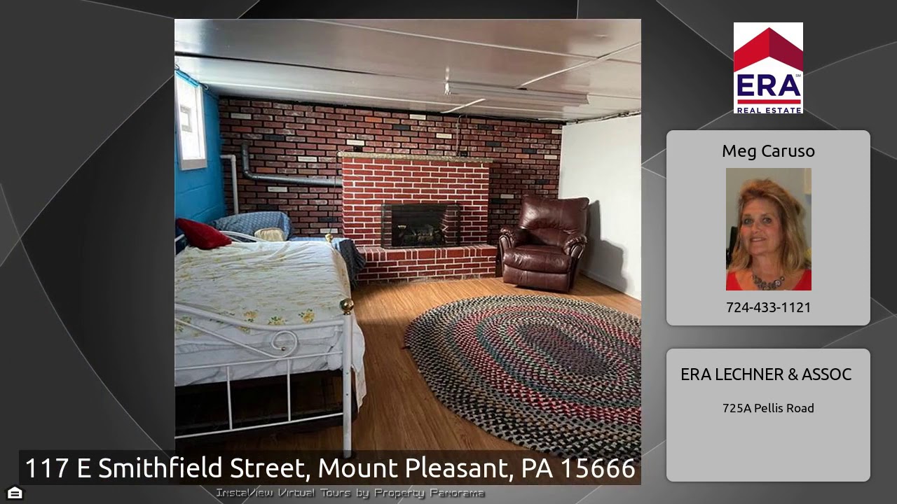 The Virtual Tour for the property at 117 E Smithfield Street, Mount Pleasant, PA 15666 listed for $124,900: Other homes for sale by Meg Caruso of ERA LECHNER & ASSOC: One floor living with large upstairs area for huge bedroom. New concrete sidewalks and porch steps. Room for off street parking on right side and room off paved rear alley to create rear parking. Paved driveway to 2 car detached garage with man door. House has been well maintained. Newer French doors lead to sun porch. Large dining room and living room with fireplace. Big kitchen with island and pantry area. Counter space for the …