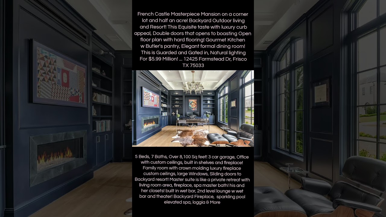“FRENCH CASTLE MASTERPIECE MANSION” On a Corner Lot and Sitting on Nearly half an acre with Backyard Outdoor Living and Resort ! 🏰🏰🏠 Priced $5.99 Million! … Located: 12425 Farmstead Dr, Frisco, TX 75033