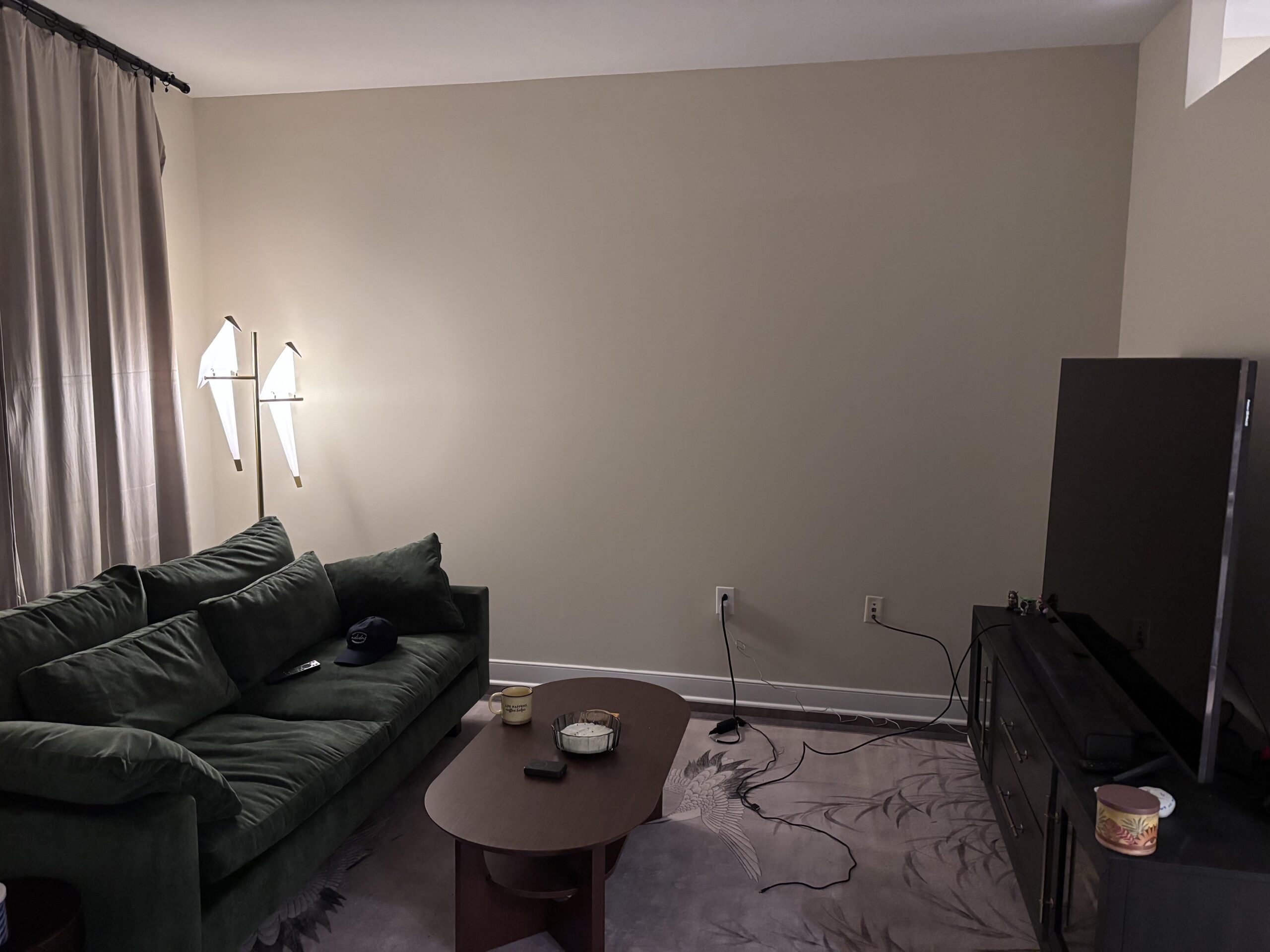 this is an apartment, mid century modern and the rug has a Japanese vibe to it (cranes and bamboo). i feel like a slim table would crowd the space but i wanted to play with wall art and floor art. but again i think floor art would also be too busy.