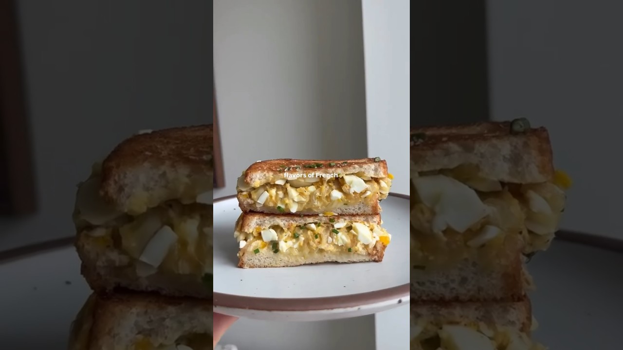 4. Make the sandwich: Equally divide the egg salad mixture and top on two slices of sourdough, then top each half with 1/3 cup shredded gruyere cheese, then the remaining piece of sourdough. Heat the same skillet you caramelized the onions in over medium-heat, then melt 1/2 tbsp. of butter. Grill each sandwich until golden brown and crispy, about 4 minutes on each side, adding 1/2 tbsp. of butter after flipping. Top with finely chopped chives and flaky sea salt before slicing and serving.