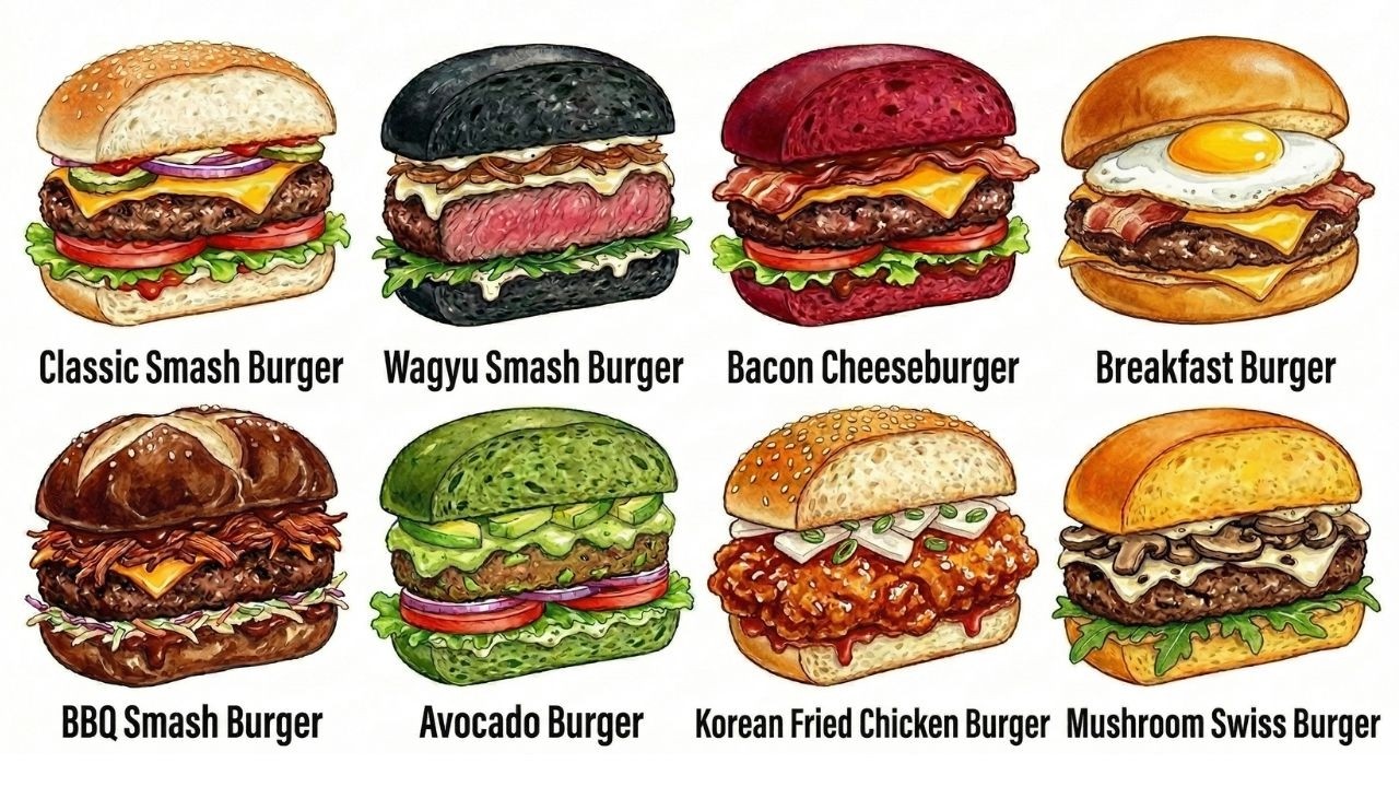 Every burger style explained — from Classic Smash and Oklahoma Onion to Wagyu Truffle, Korean Kimchi, Birria, Luther Burger, and more. We break down where each one comes from, what goes into it, and what makes it different from everything else.