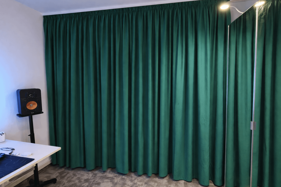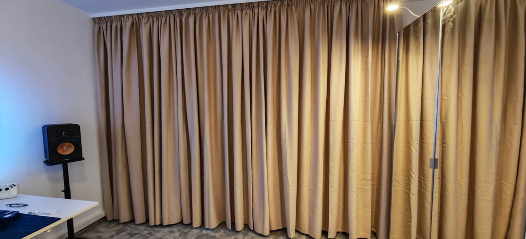 Please change the lighting to warm yellow. Add art to the walls etc. Would love to see a picture of the whole room for more context, because right now it really does look like a hotel room or venue curtains from that angle.