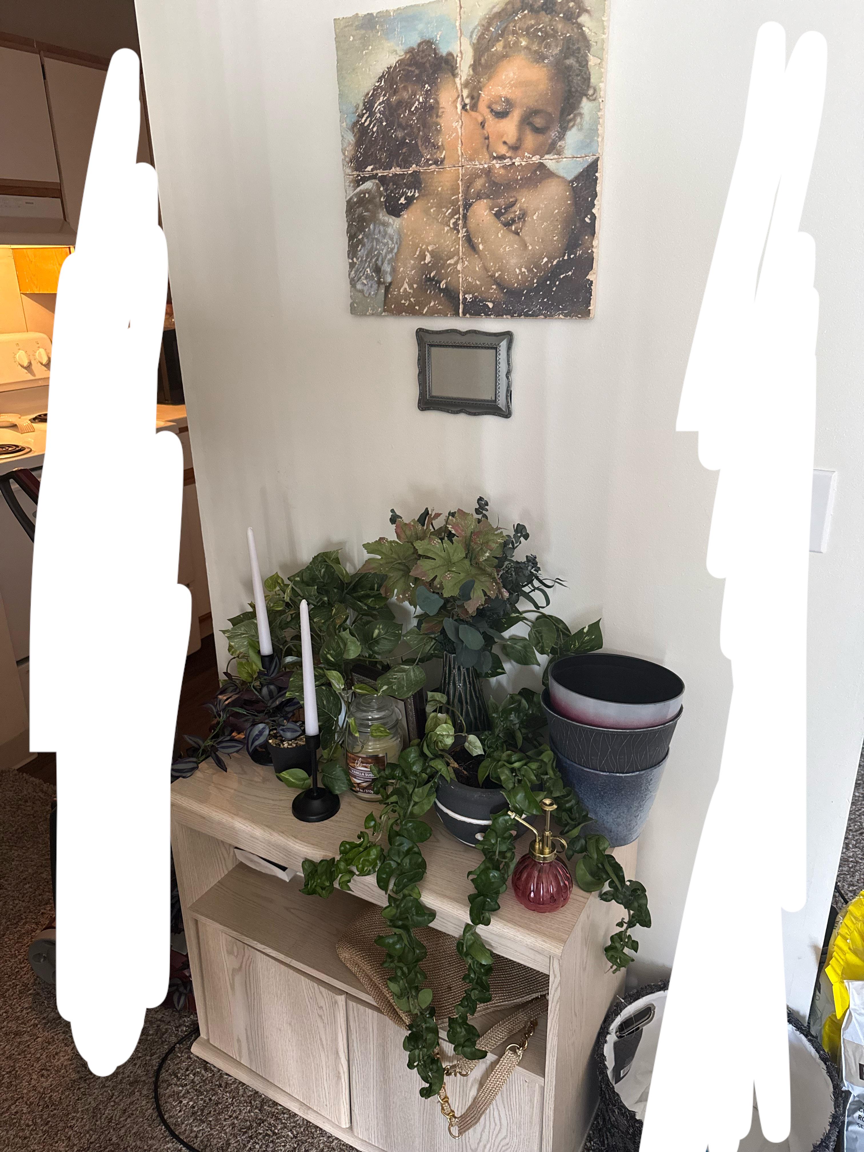 Does this area look tacky? I have to add a picture in the frame, and I’m planning on removing any fake plants with real ones once I get a few more pots. Any feedback would be appreciated!