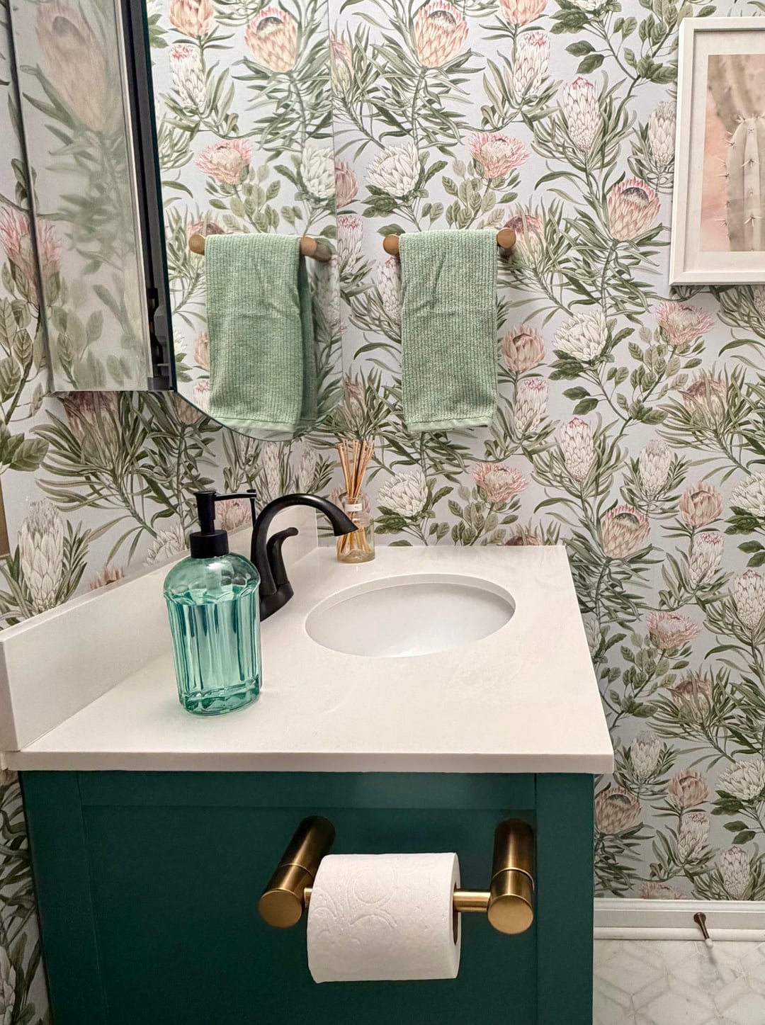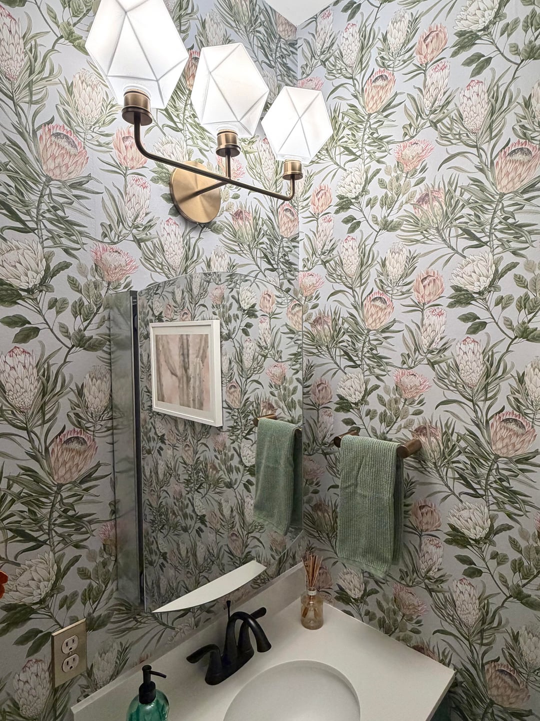Wow! That wallpaper is incredible. The perfect but of pink and green. Looks great!