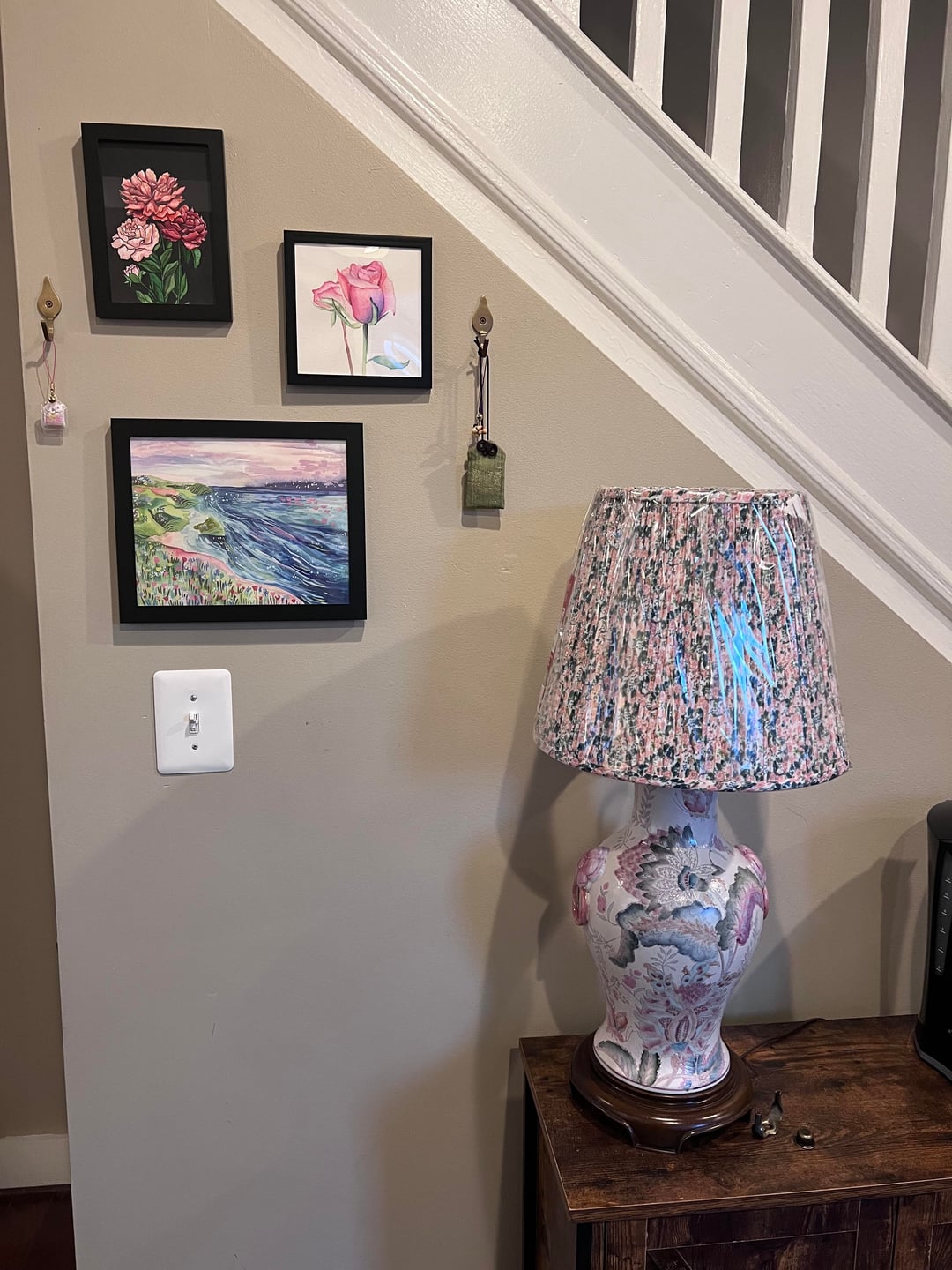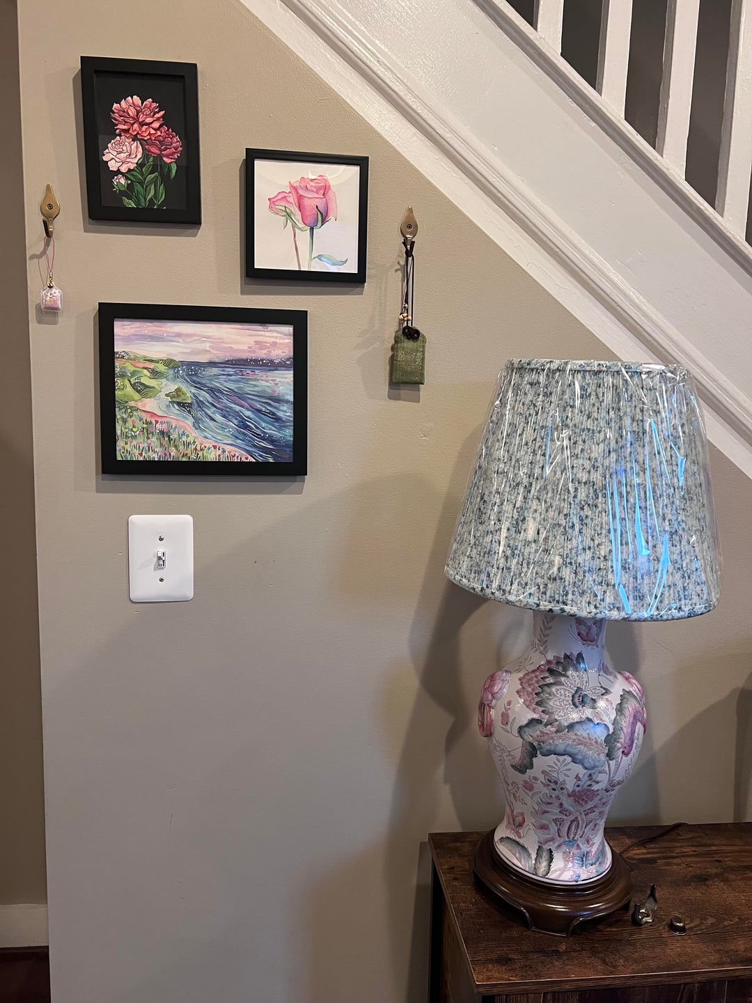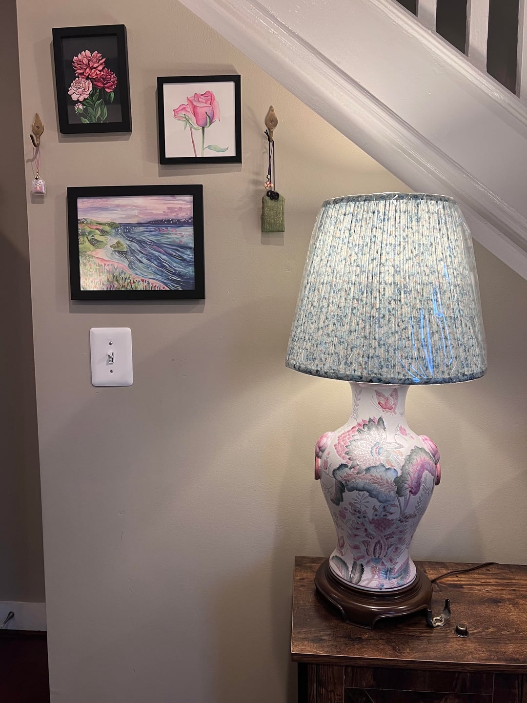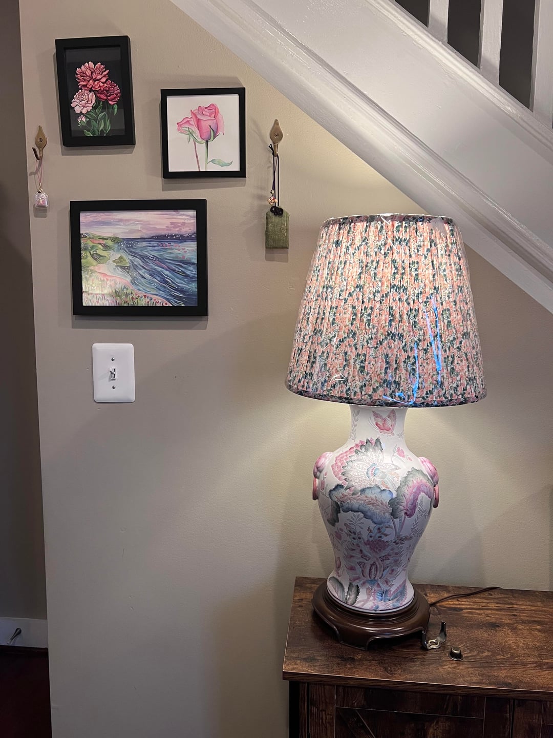 I posted previously to help pick out a lampshade, but later realized with shipping charges many of those options were out of my budget. The solid color one I picked ended up being too short and I had to return it. These two are my last options – I’m hoping the small size of the pattern keeps it from clashing or looking too busy. Out of these, which one looks better?