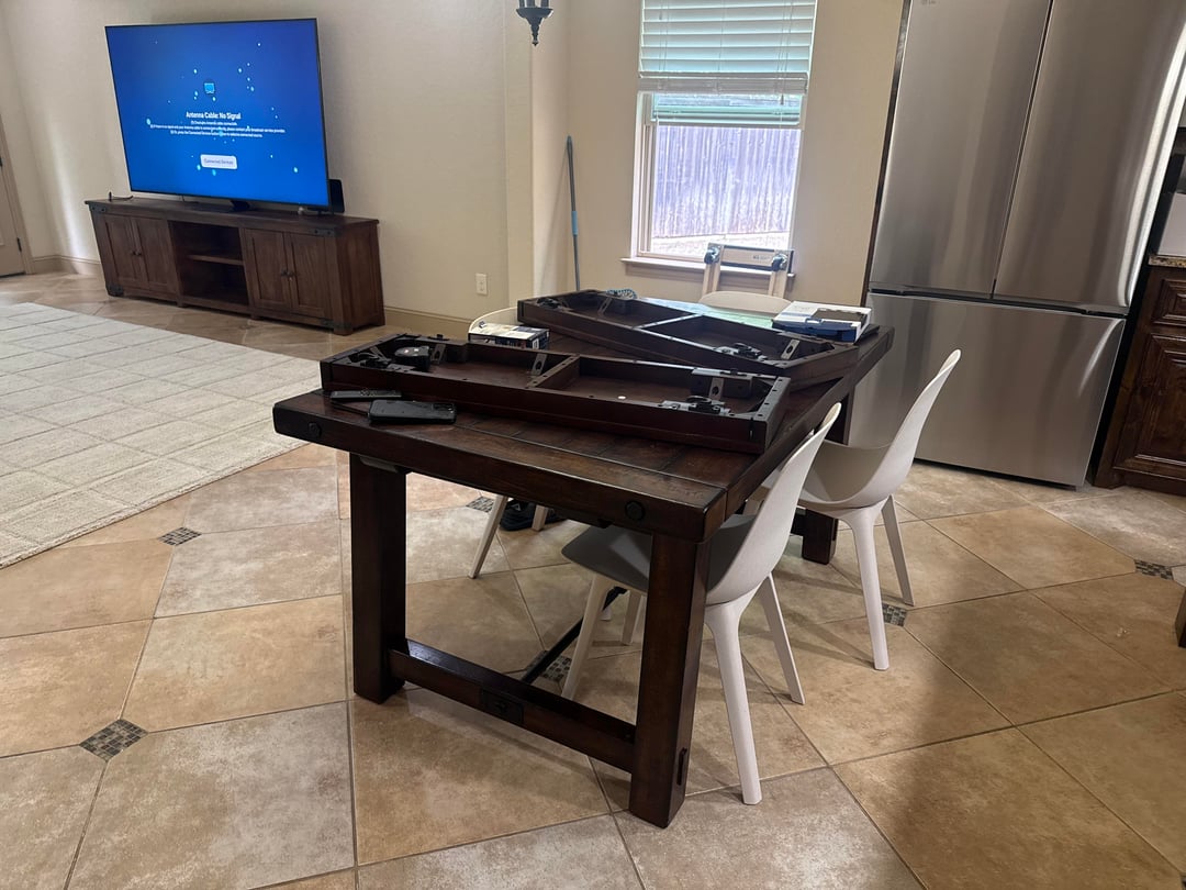Living area of new house is one big room. I don't have a picture of the kitchen, but it's behind the dining area with a counter height bar that faces the table.