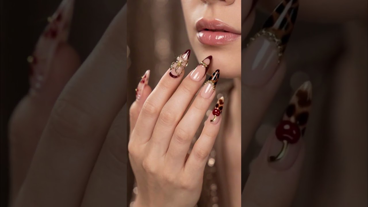 🍒 Index & Pinky: A creamy nude base with a classic Tortoise Shell French Tip, accented with elegant gold curved lines and studs.