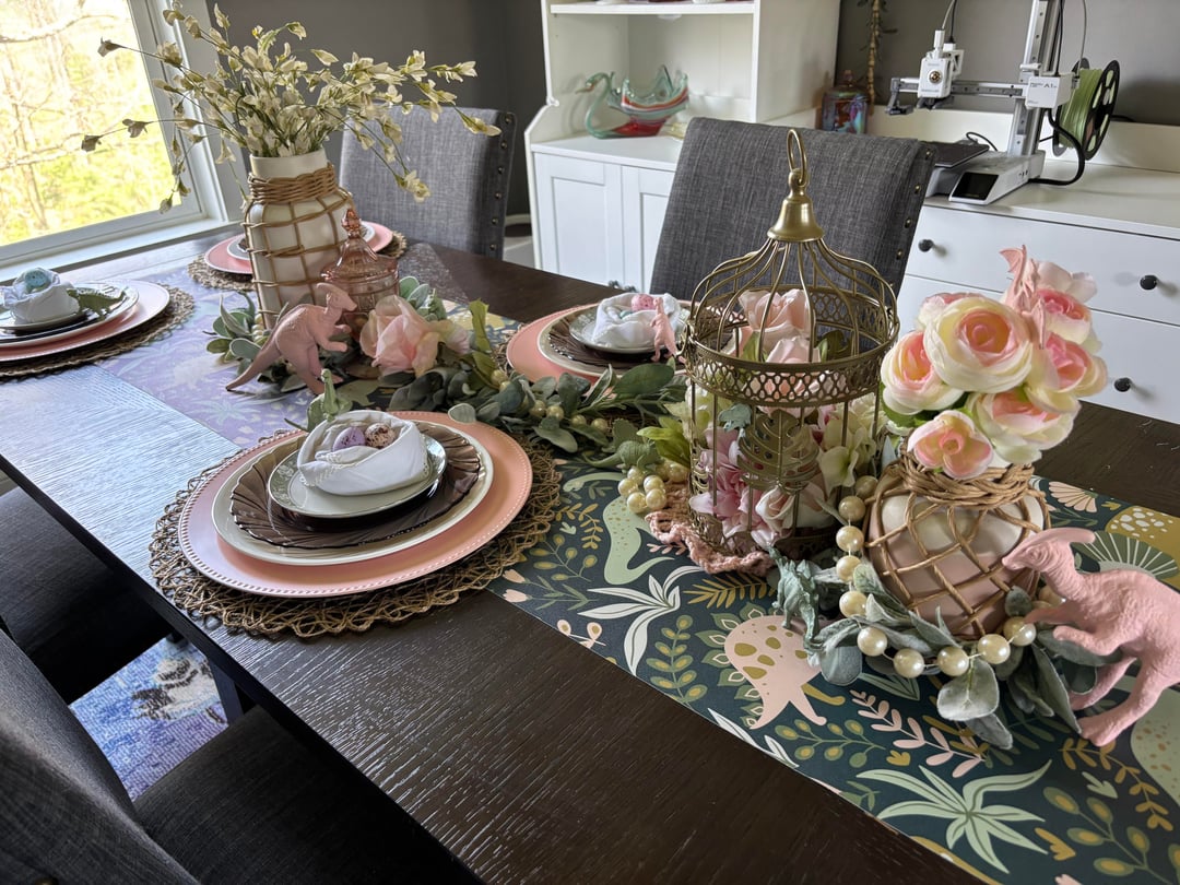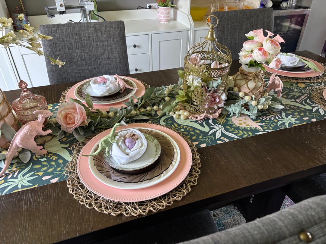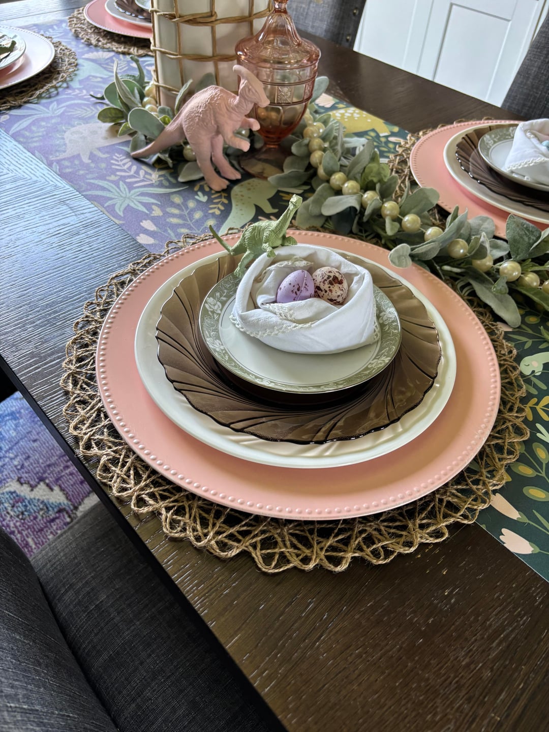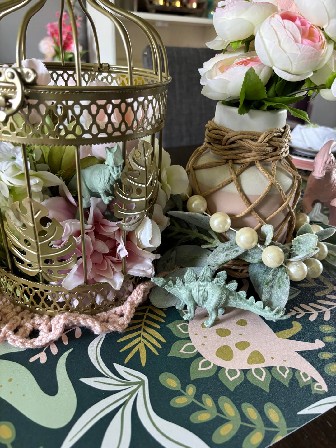 My favorite type of decorating is doing tablescapes. Honestly, we never eat in here so its entire function is to serve as a way for me to decorate. I saw this wallpaper on Amazon and decided that I needed to do a dinosaur themed table haha. I painted plastic dinosaurs with matte acrylic paint.