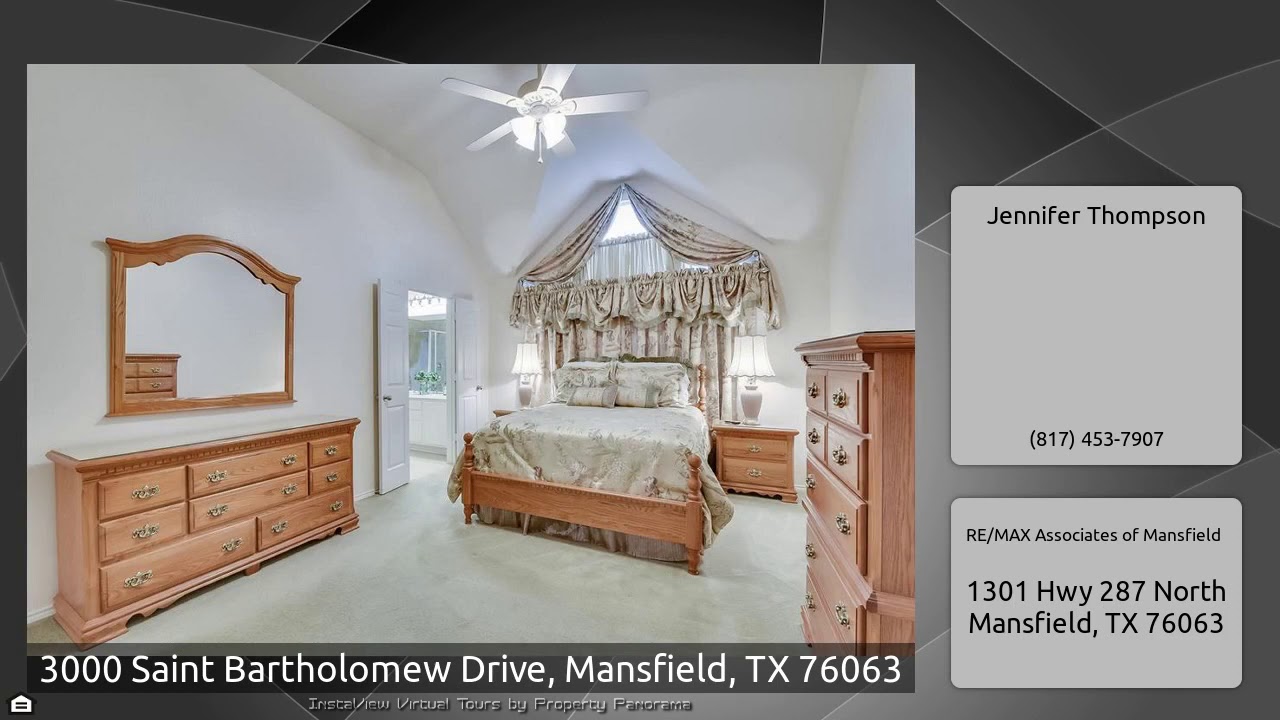 The Virtual Tour for the property at 3000 Saint Bartholomew Drive, Mansfield, TX 76063 listed for $294,900: Other homes for sale by Jennifer Thompson of RE/MAX Associates of Mansfield: Well maintained home located on quiet cul de sac! Open floorplan ideal for entertaining with sitting area & formal dining room at front of house with easy access to kitchen. The study features french doors & can be used as 4th bedroom. Spacious kitchen has plenty of storage & opens to the breakfast nook & family room. All bedrooms have generous sized closets & new ceilings fans! 3 car side entry garage is a …
