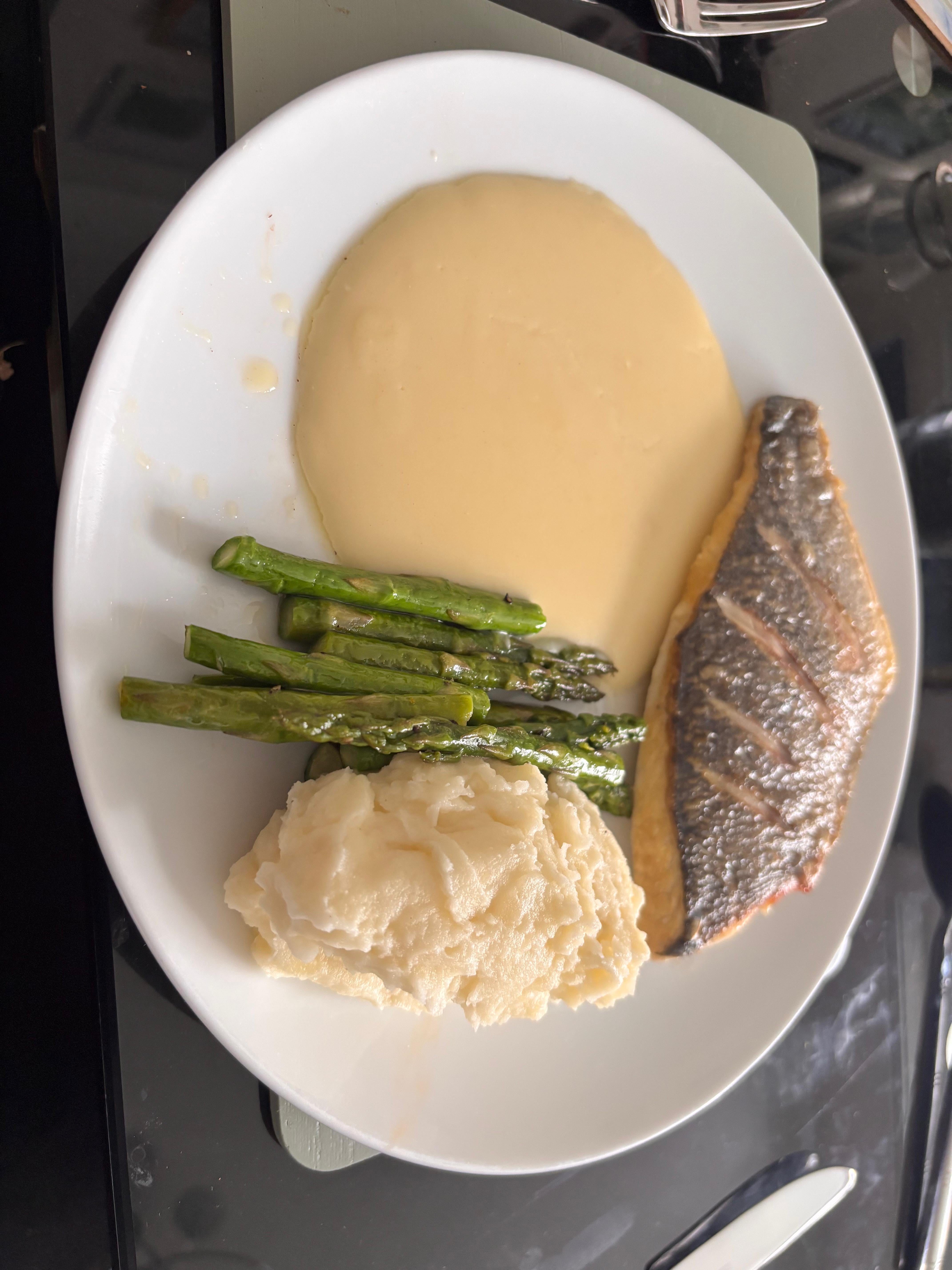 Pan fried sea bream, mash, asparagus with an over exuberant helping of slightly cheesy white sauce.