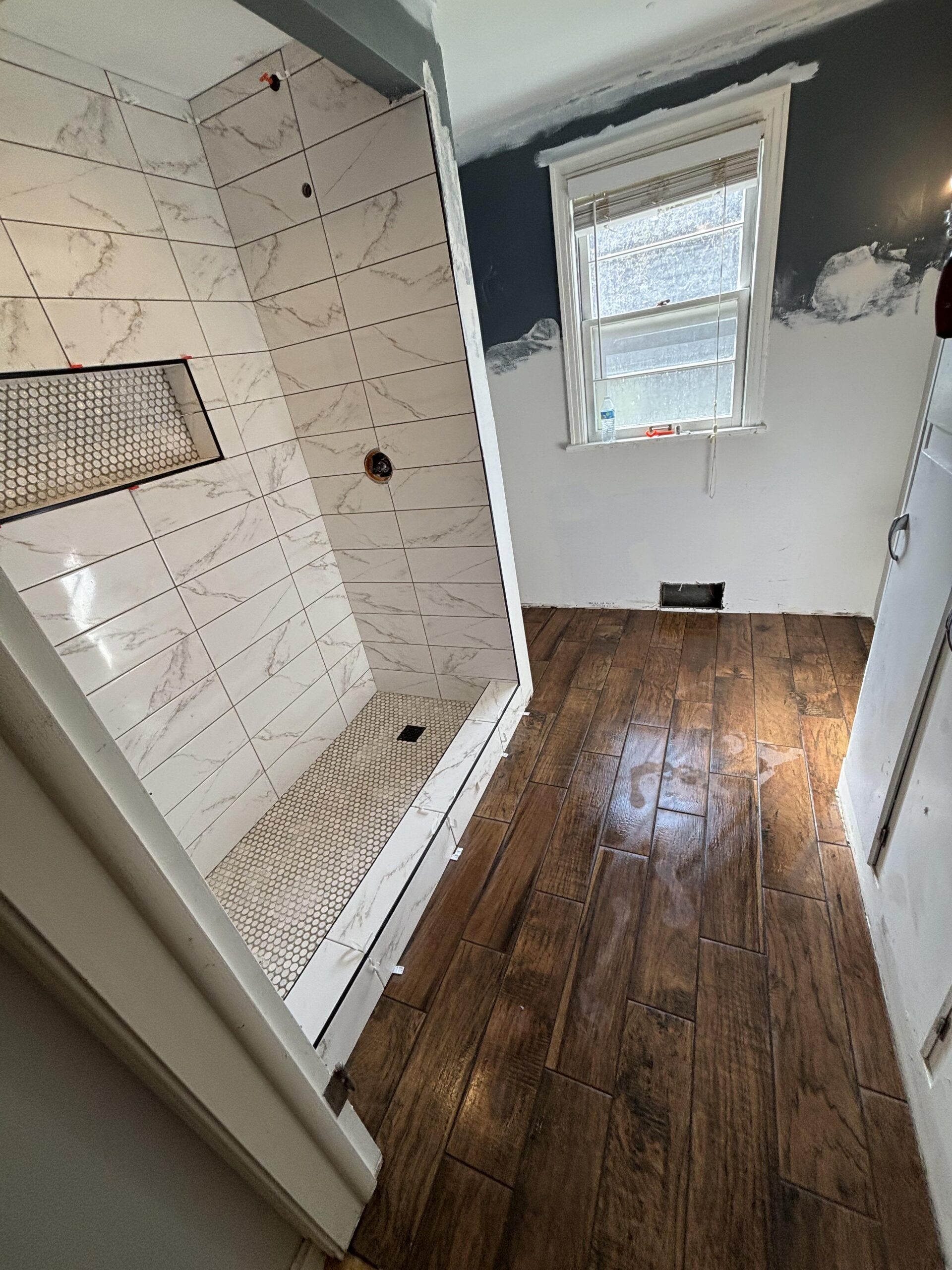 Hi! So we totally gutted and are in the process of remodeling our bathroom.. brand new shower and floor and I thought I was set on Conifer Green for the walls and some sort of cream color for our cabinets but now I’m not even sure if green is a good option! This is where we are now.. any ideas would be appreciated!!!